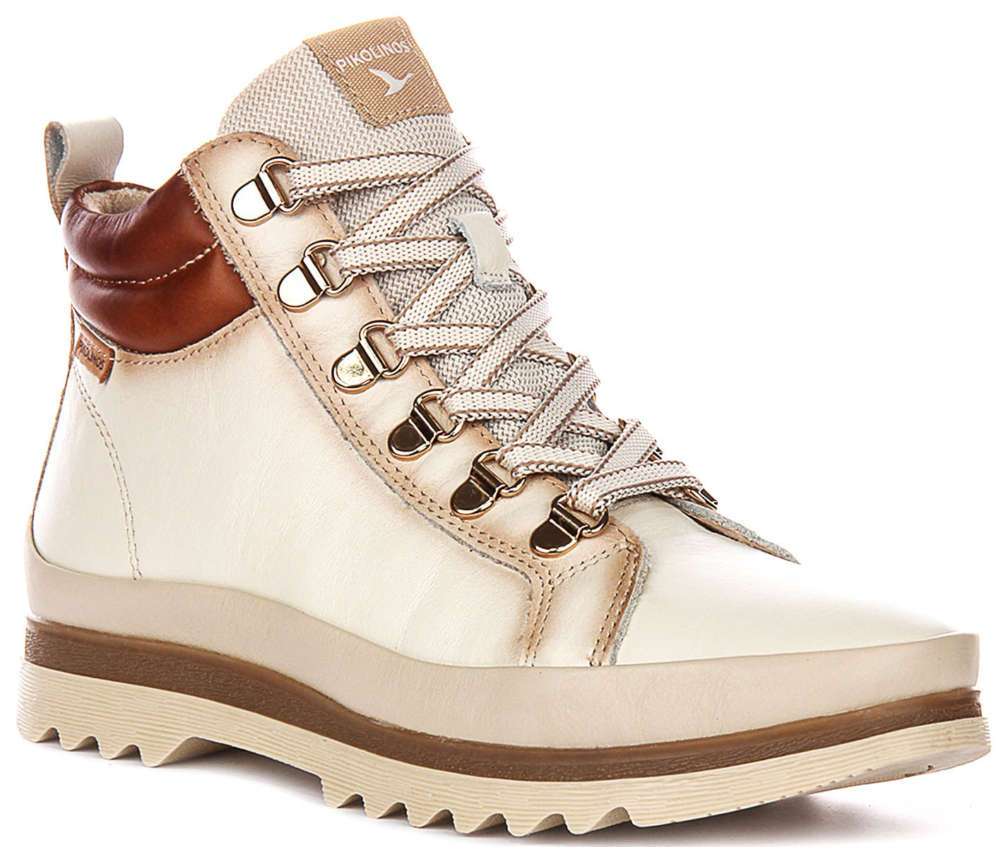 Designed for practicality and style, the Vigo boots feature a robust lace-up fastening system with six pairs of sturdy, golden-toned D-ring eyelets, paired with durable braided laces in a matching cream hue. For added convenience, an inner side zip allows for easy on and off without the need to fully unlace. The padded tongue, adorned with the subtle Pikolinos logo, along with a practical pull tab at the heel, further contributes to the boot's user-friendly design.