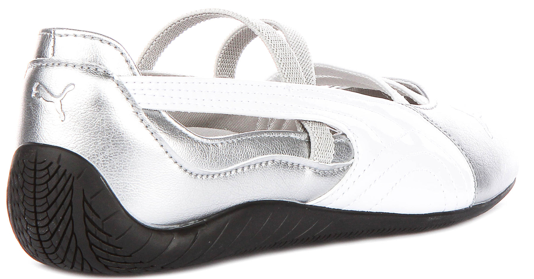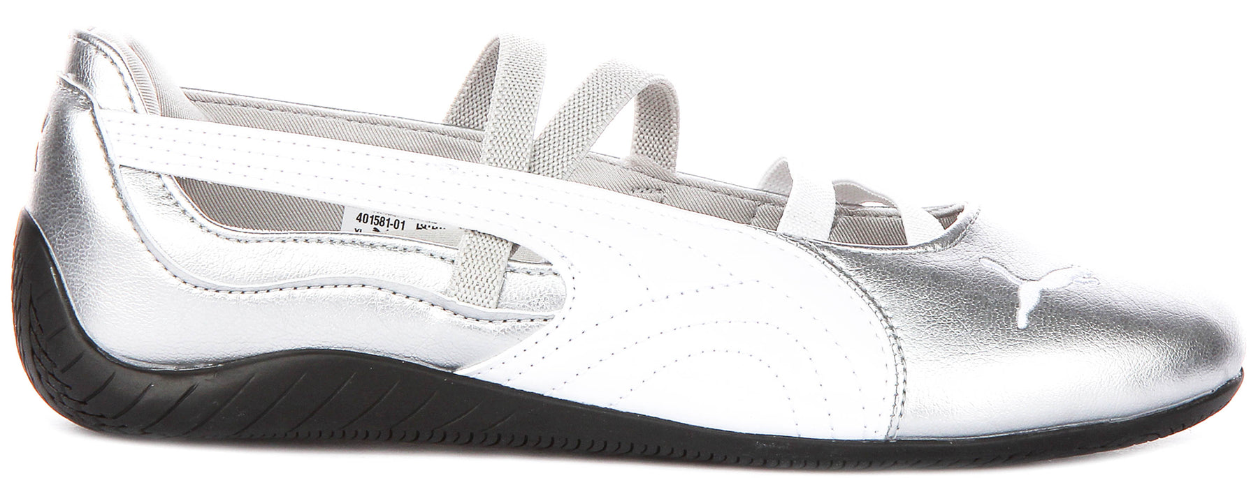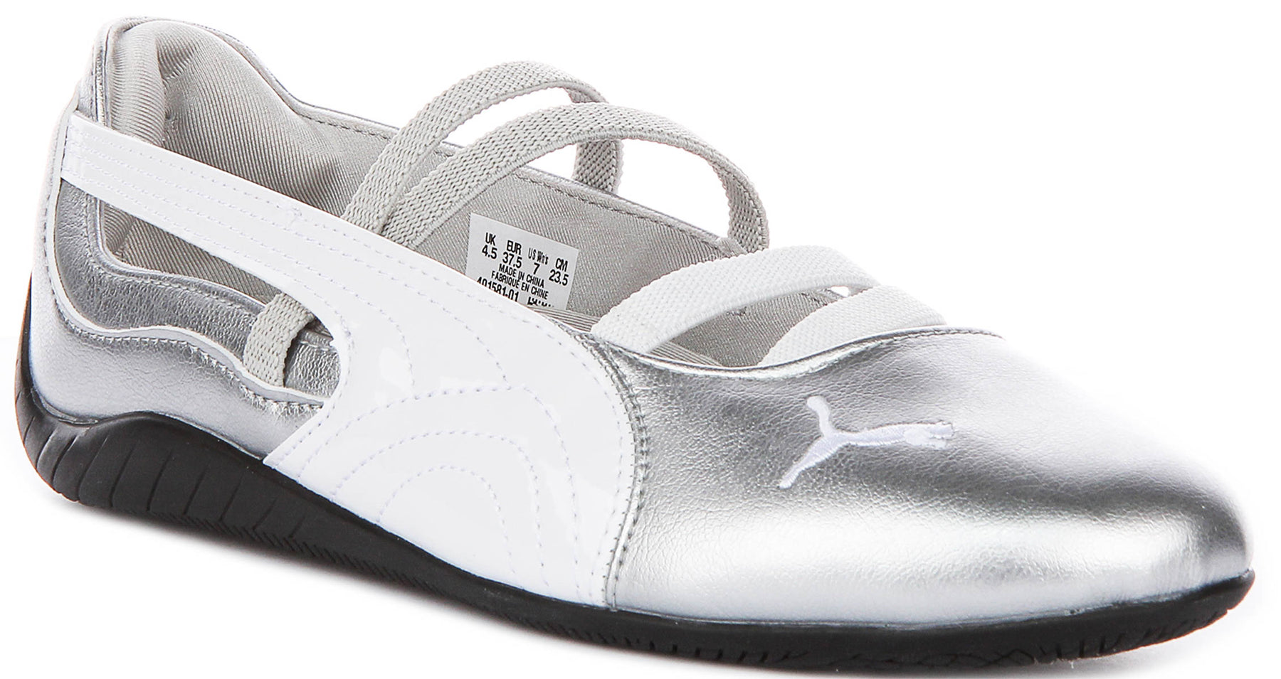 The Puma SC Ballet is a striking pair of synthetic trainers designed specifically for women who appreciate contemporary style combined with practical comfort. This eye-catching shoe features a stunning silver metallic finish on the toe box and heel area, which contrasts beautifully with crisp white synthetic panels across the upper. The colour combination creates a modern, eye-catching aesthetic that works equally well for casual everyday wear or light athletic activities.