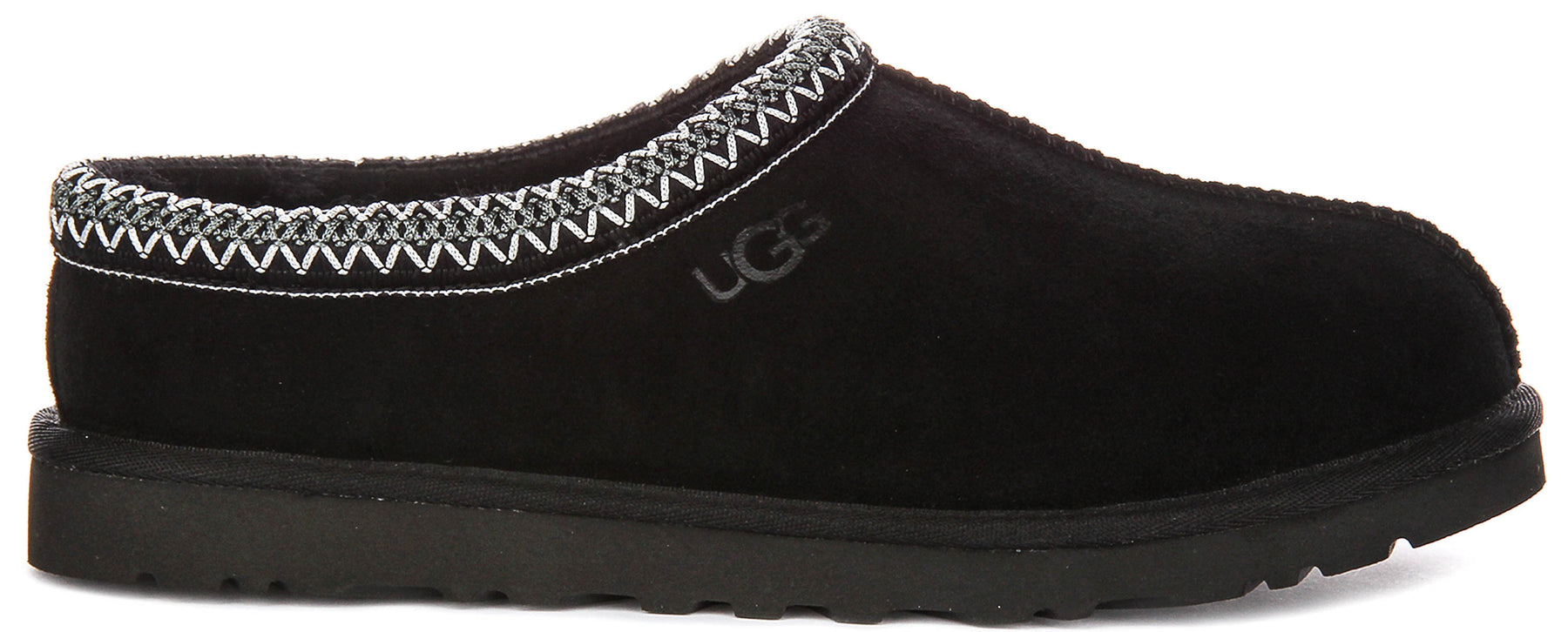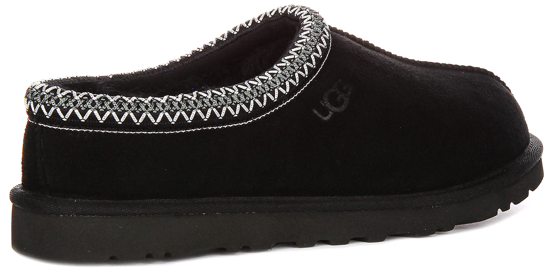 The Tasman Ii features a luxurious outer made from premium suede leather, presented in a sleek black finish that exudes understated sophistication. This rich, soft material not only offers a refined aesthetic but also promises durability and a delightful tactile experience. A distinctive element of this design is the iconic Tasman braid detailing that gracefully encircles the collar, showcasing an intricate pattern of grey, silver, and white tones, further accented by delicate white zigzag stitching, adding a unique touch of artisanal charm. The subtle UGG branding is embossed on the side, a mark of authentic quality.