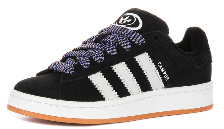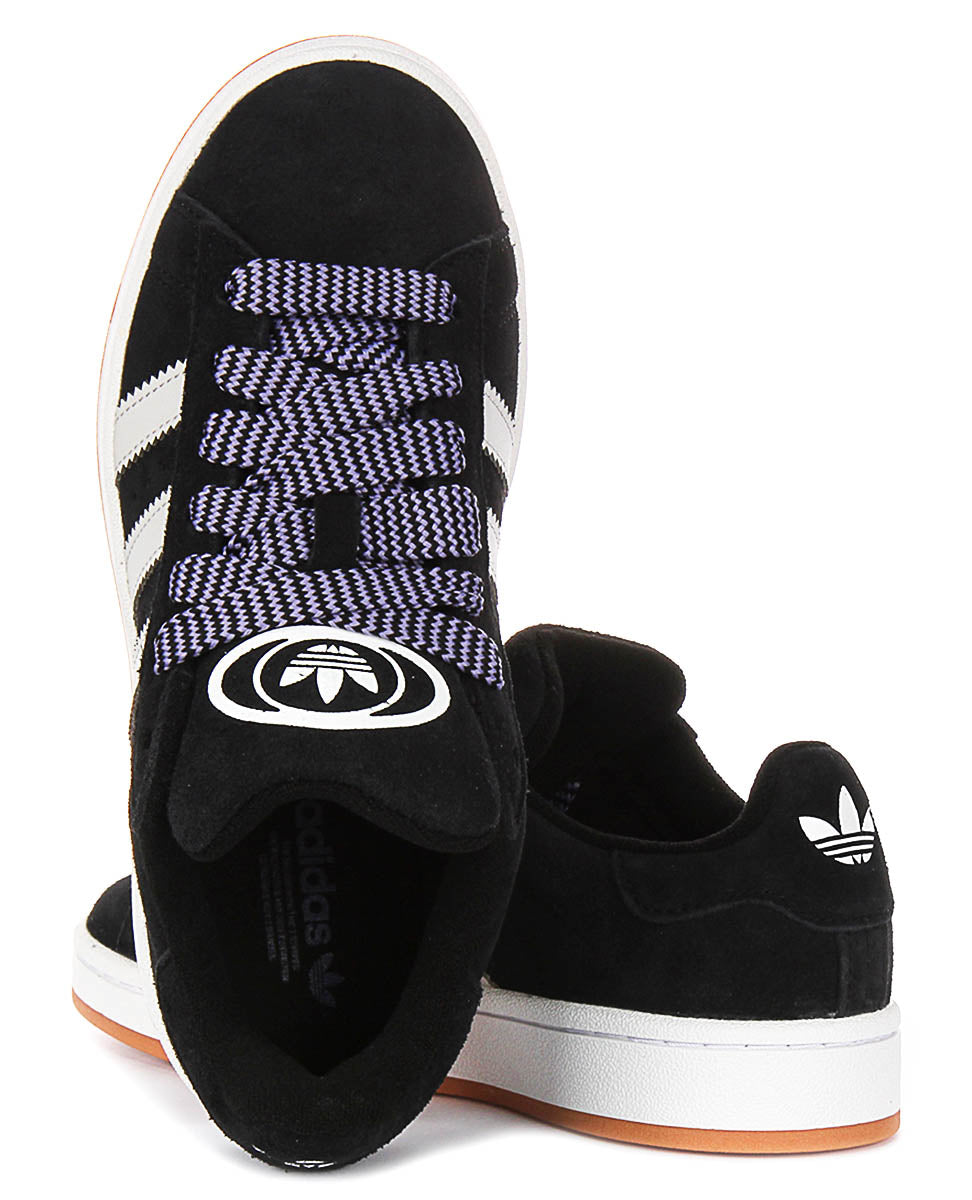 Las zapatillas presentan una llamativa parte superior negra, contrastada por las inconfundibles tres franjas de Adidas en blanco puro en los laterales. El audaz logotipo CAMPUS se sitúa orgullosamente junto a las franjas, destacando las raíces históricas del modelo. Los cordones gruesos y redondeados en blanco y negro añaden un toque divertido y juvenil, mientras que el prominente logo Trefoil de Adidas en la lengüeta y la pestaña del talón reafirma la autenticidad y el atractivo clásico de este par.