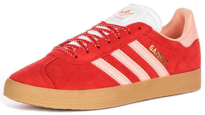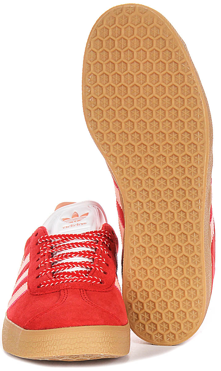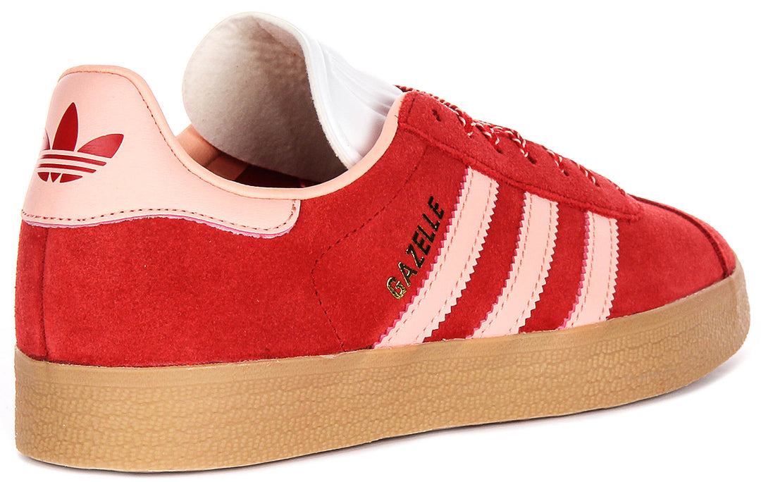 El material exterior de estas zapatillas es ante de primera calidad, que les proporciona un acabado suave pero duradero. El rico ante rojo se complementa perfectamente con las franjas y el talón en rosa pálido de Adidas, creando un contraste llamativo y elegante que destaca con cada paso. El emblemático logo dorado ‘GAZELLE’ en el panel lateral añade un toque de lujo y autenticidad, subrayando su estatus como modelo icónico.