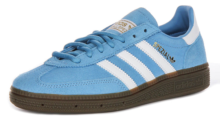 El material exterior está confeccionado en cuero ante de primera calidad, ofreciendo un aspecto y tacto lujosos, además de asegurar durabilidad y transpirabilidad. Las zapatillas presentan un llamativo color azul claro, realzado por las icónicas tres franjas blancas de Adidas en los laterales, complementadas con el branding dorado ‘Spezial’ y detalles del logo de Adidas. La lengüeta y el tirador trasero en blanco aportan un contraste limpio, mientras que la suela de goma marrón no solo proporciona un agarre fiable, sino que también refuerza el atractivo vintage de esta silueta atemporal.