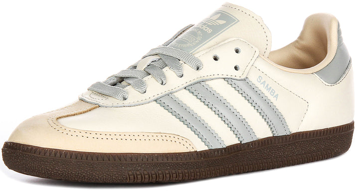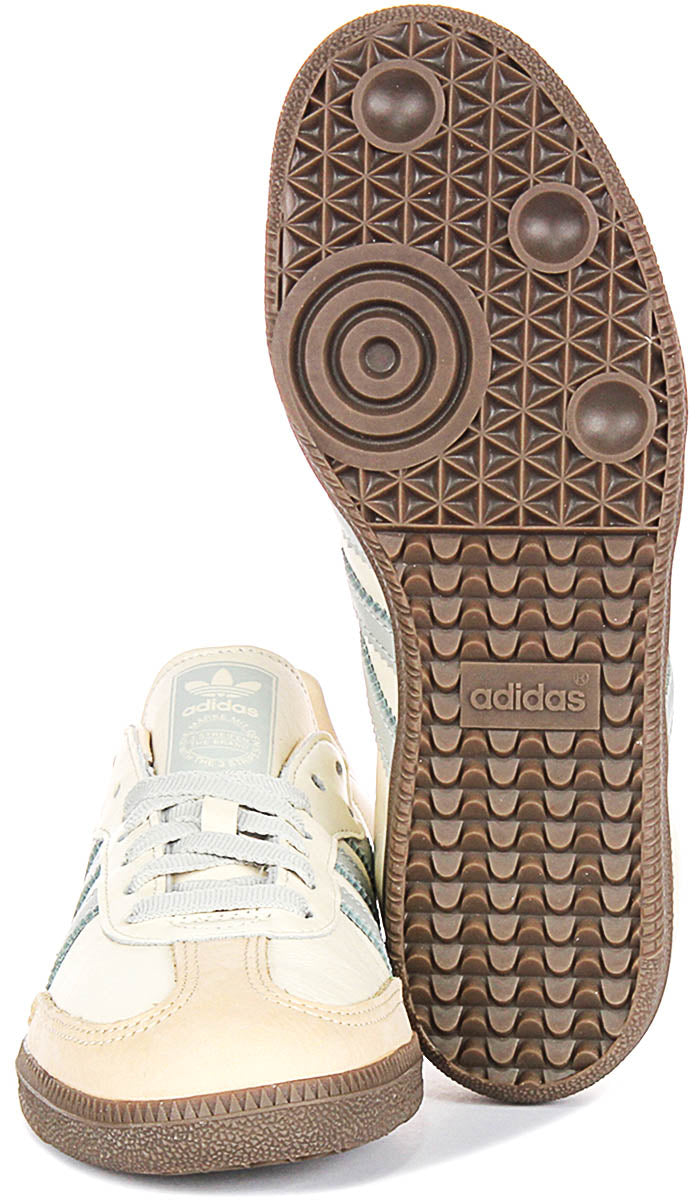 Fabricadas con cuero de alta calidad, el material exterior de las Samba OG garantiza durabilidad mientras ofrece un acabado premium y suave. La combinación de colores en crema suave y gris claro es sutilmente elegante, con delicados acentos en gamuza beige en la puntera que aportan textura y distinción. Las tres franjas características de Adidas aparecen en gris pálido a lo largo del lateral, complementadas con cordones grises a juego y el branding Samba en plateado para un acabado refinado.