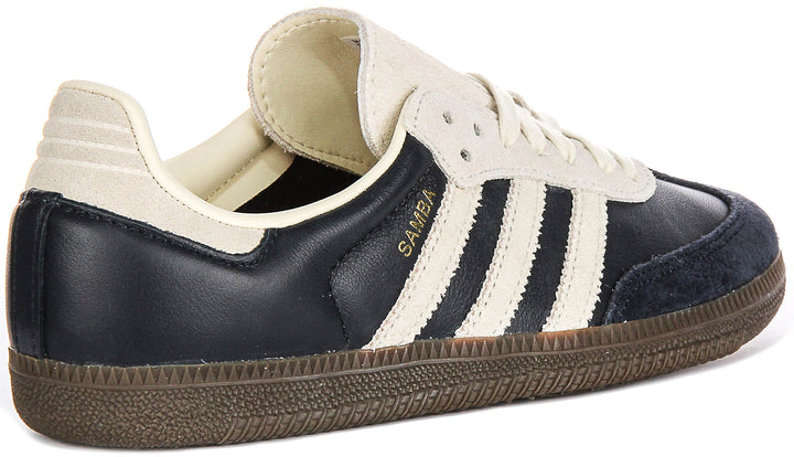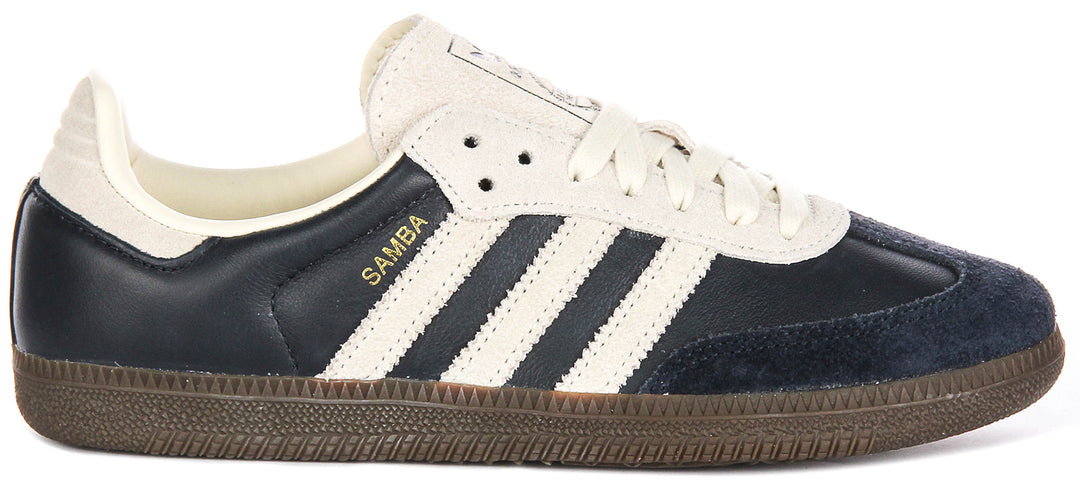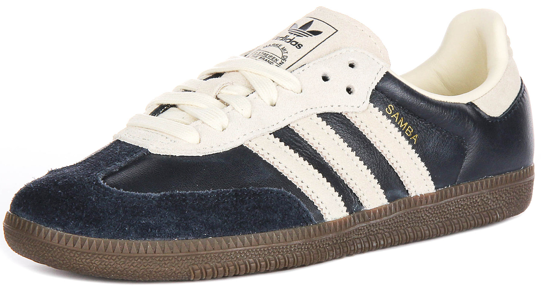 Diseñadas específicamente para hombres, las Samba OG cuentan con el emblemático logotipo dorado "SAMBA" en el lateral, que añade un toque de encanto tradicional. La lengüeta y el forro interior están hechos de materiales suaves y transpirables para garantizar comodidad durante todo el día. La suela exterior de goma natural resistente ofrece una excelente tracción y agarre, haciendo que estas zapatillas sean aptas tanto para superficies interiores como exteriores.