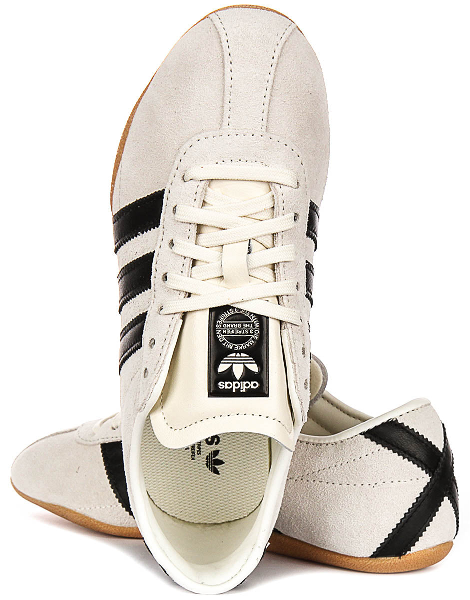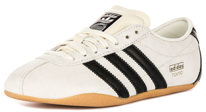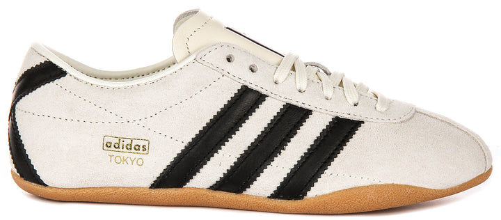 El diseño de las zapatillas Tokyo W es instantáneamente reconocible con las icónicas tres rayas de Adidas en un contraste de color negro, destacándose audazmente contra la gamuza de un blanco roto. También notarás la palabra 'TOKYO' elegantemente exhibida en letras doradas en el lateral, añadiendo un toque de distinción y rindiendo homenaje a la herencia del zapato. Las zapatillas se completan con clásicos cordones en un tono blanco roto, que complementan la sutil paleta de colores en general.