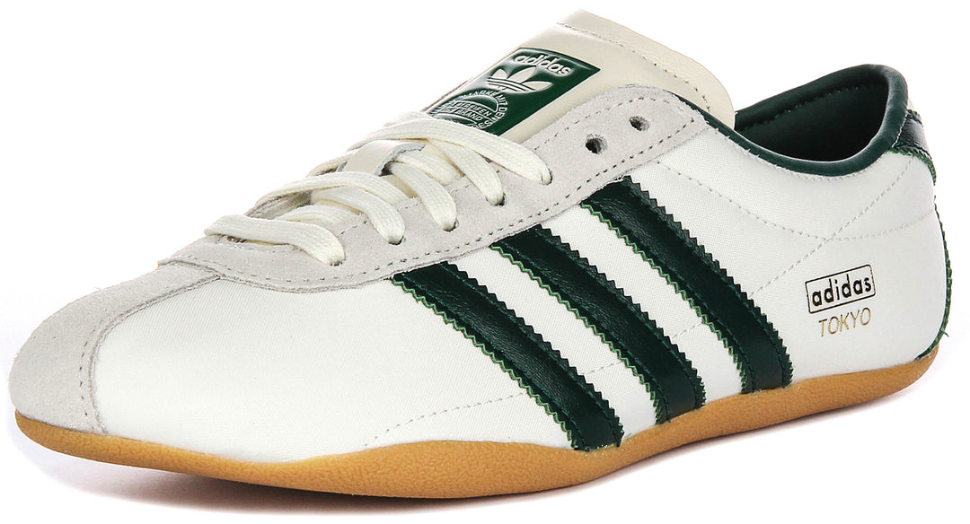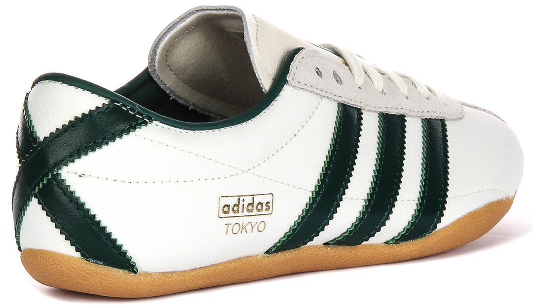El material exterior de estas zapatillas está hecho de cuero de ante premium, lo que les brinda una sensación lujosa y un acabado duradero. La parte superior presenta un tono blanco hueso nítido, contrastado de manera elegante por las icónicas tres franjas de Adidas en verde oscuro, haciendo que estos zapatos sean fácilmente combinables y llenos de estilo. La sutil marca dorada Adidas Tokyo en el lateral añade un toque de exclusividad y tradición al diseño.