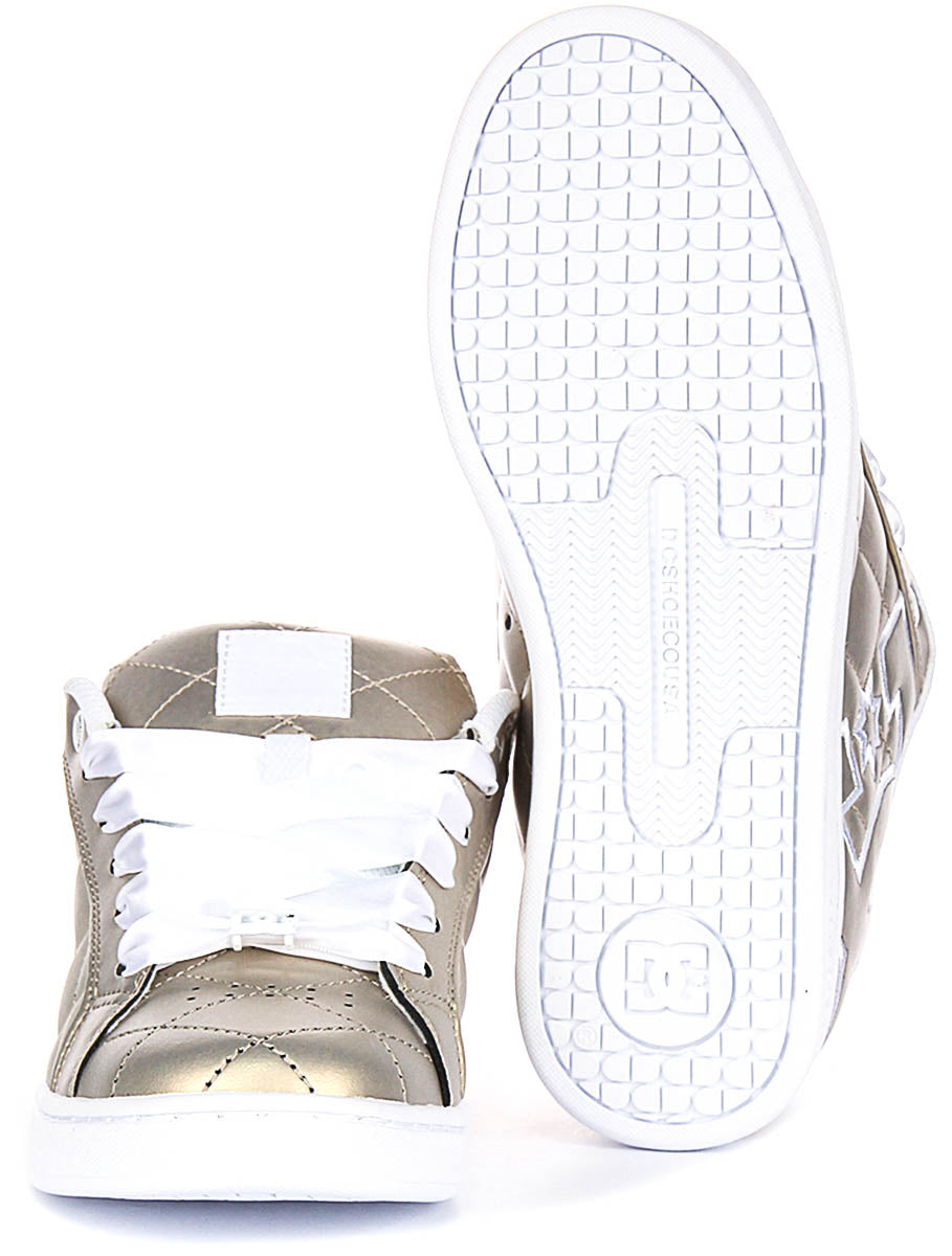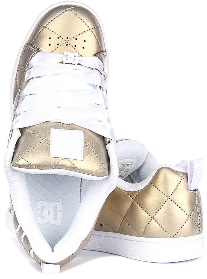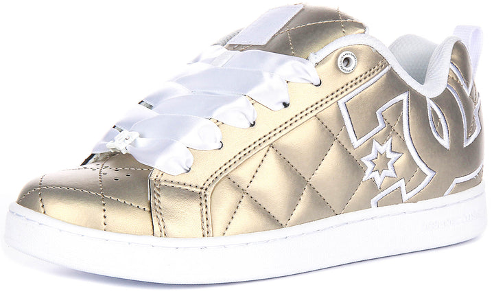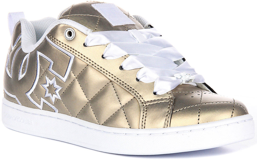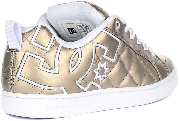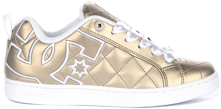Presentamos las Zapatillas de Cuero Court Graffik S para Mujer de DC Shoes, una opción elegante y audaz para mujeres que quieren destacar con cada paso. Estas zapatillas lucen la reconocida marca DC Shoes, con el logo grande de DC bordado a lo largo del lateral en un blanco nítido, creando un contraste llamativo con el brillante material exterior en dorado.