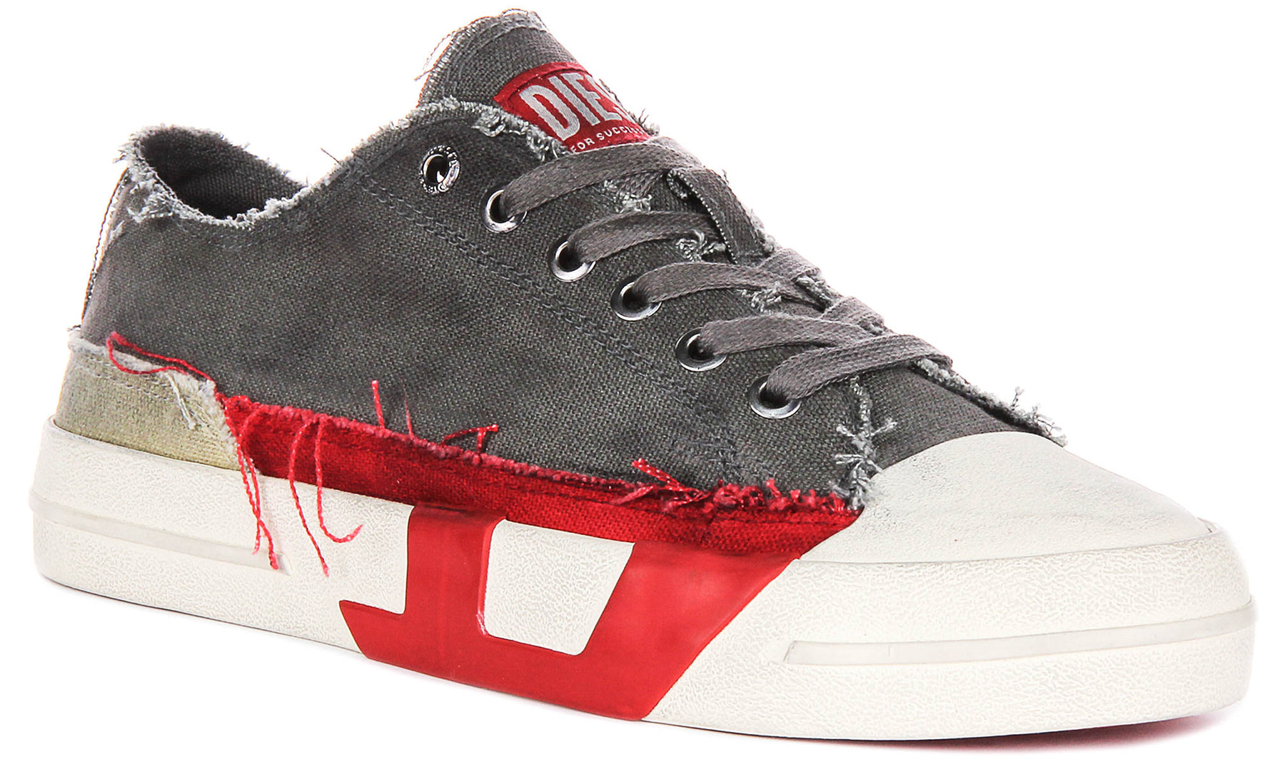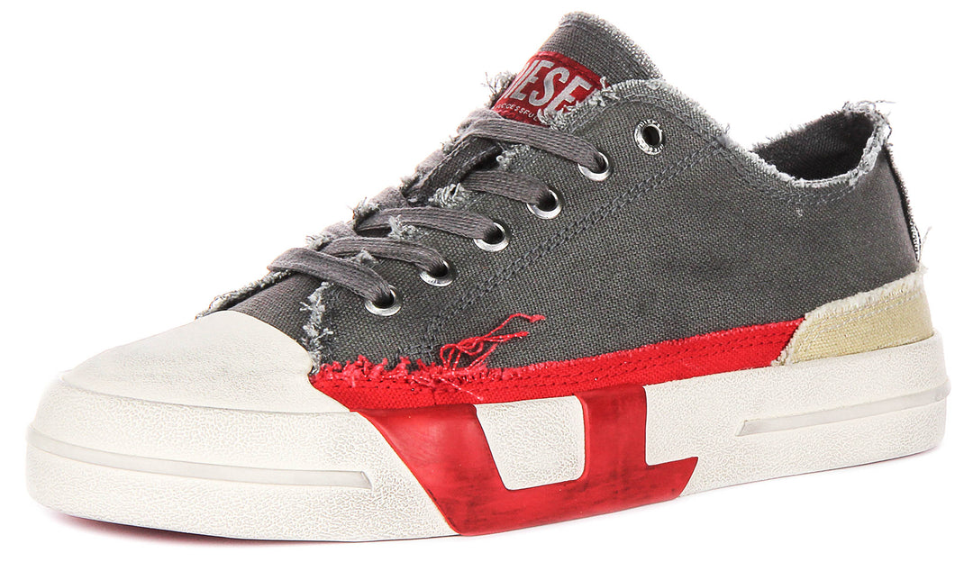 Las zapatillas S-d-verse Low exhiben un diseño único y llamativo. La lona gris está acentuada con una audaz franja roja que presenta un prominente logo 'D', instantáneamente reconocible como la marca distintiva de Diesel. La puntera y la media suela en blanco ofrecen un contraste limpio, mientras que los detalles desgastados alrededor de los bordes añaden un toque de estilo urbano y robusto. El logo de Diesel también es visible en la lengüeta, reforzando aún más la identidad de la marca.