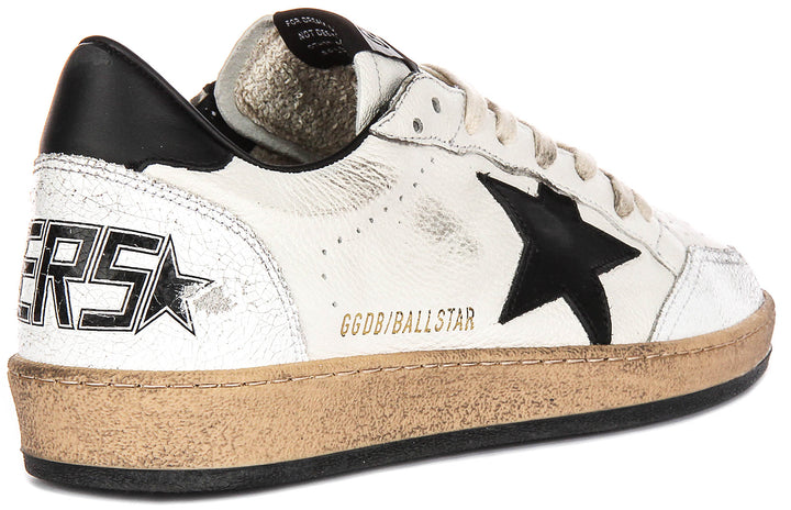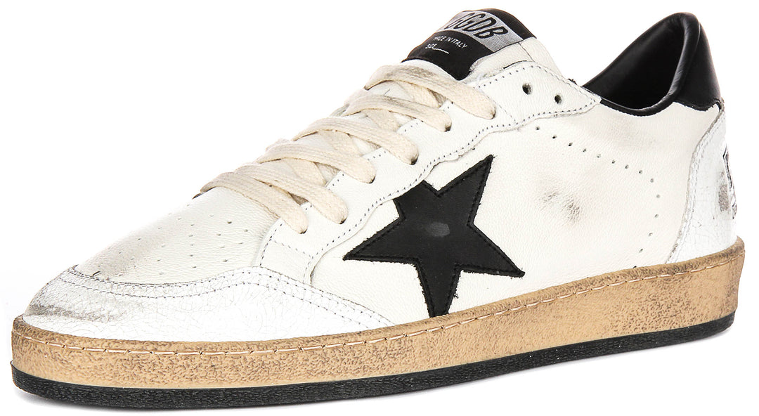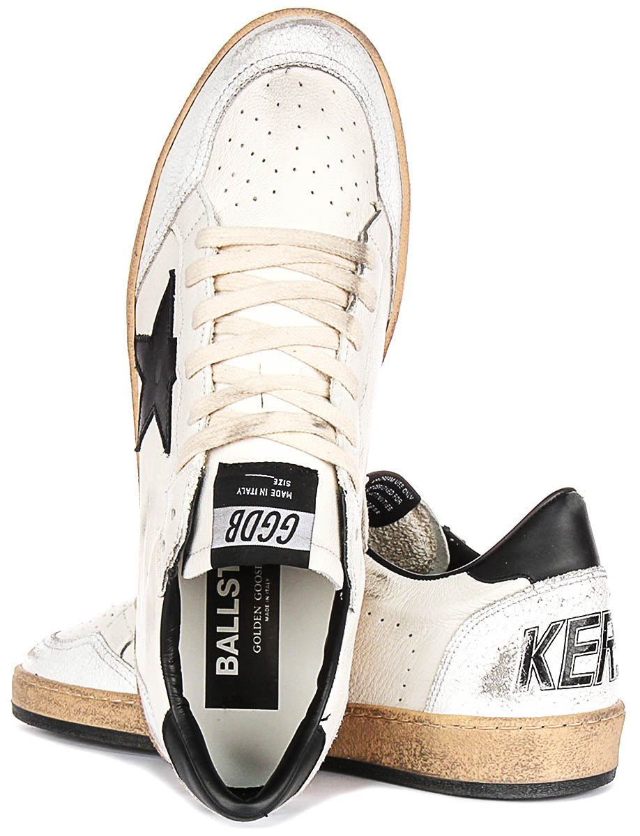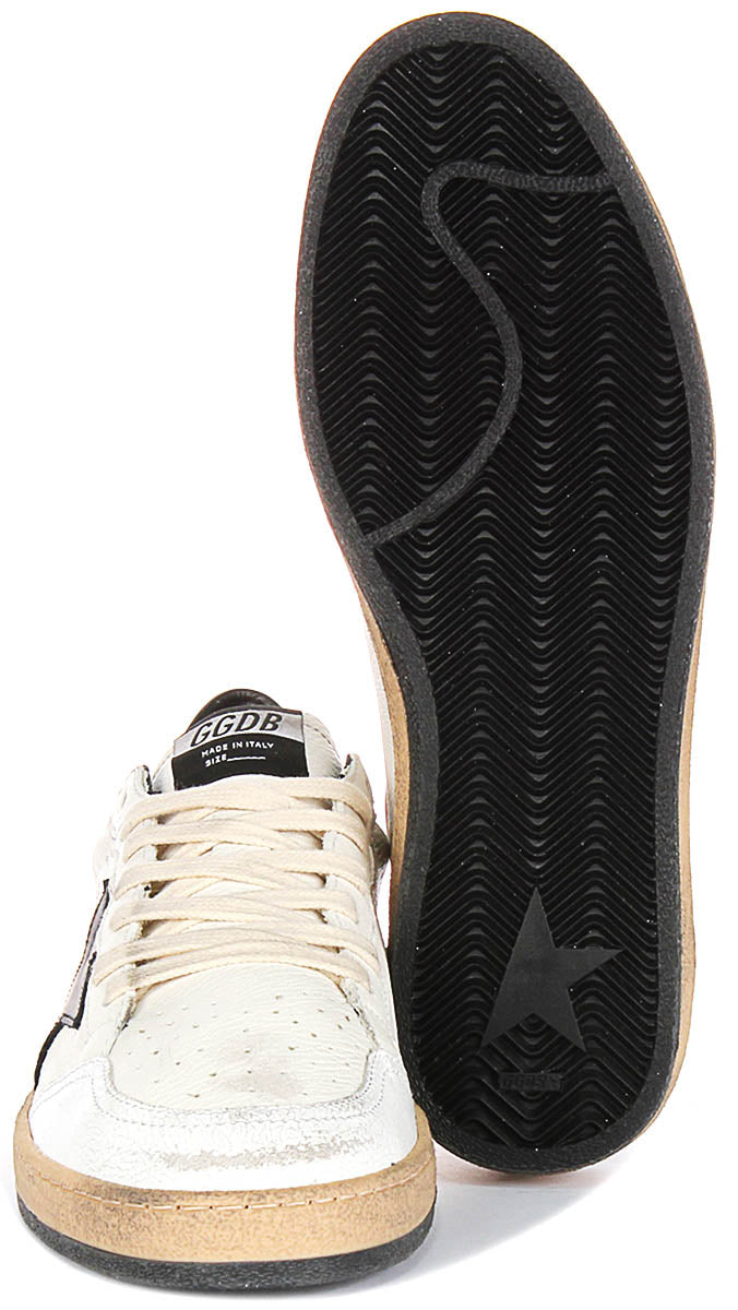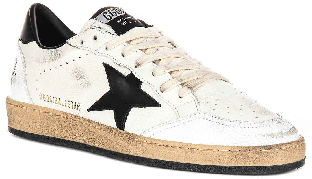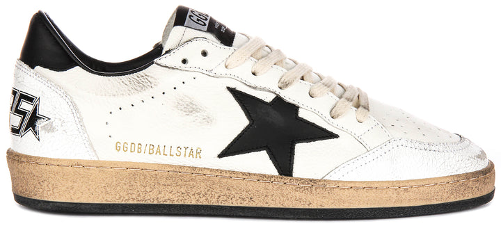 Las zapatillas presentan una parte superior de cuero blanco impecable, acentuada por un audaz motivo de estrella negra en el panel lateral, símbolo característico de la marca Golden Goose. La combinación única de colores se complementa con una lengüeta del talón en negro contrastante y sutiles detalles desgastados, aportando a estas zapatillas una estética vintage y usada que resulta a la vez moderna y con mucho estilo. Las letras doradas GGDB/BALLSTAR en el lateral resaltan aún más el carácter exclusivo de este diseño.