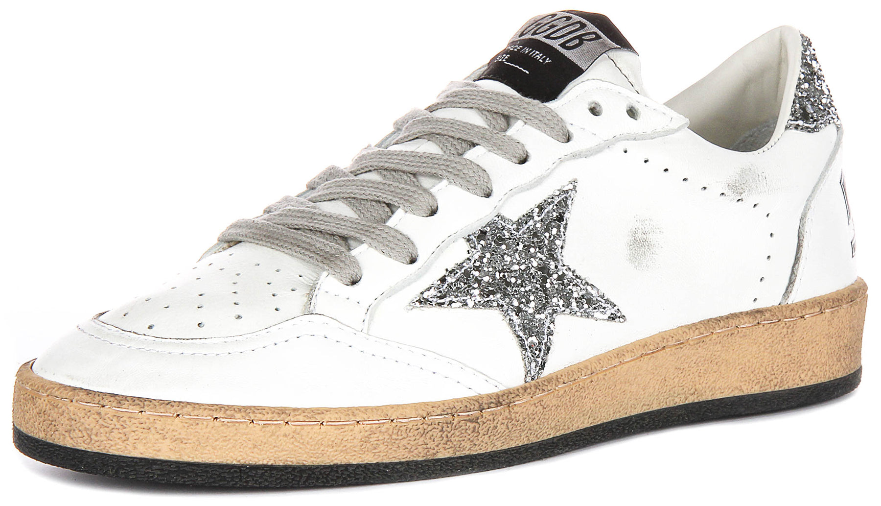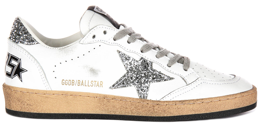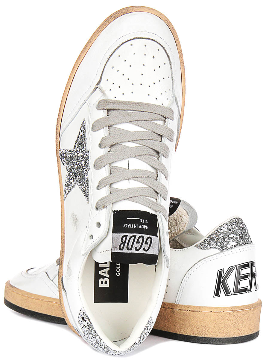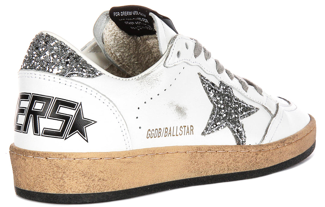 El diseño Ball Star destaca por su distintivo motivo de estrella en plata brillante en el panel lateral, aportando un toque juguetón pero sofisticado. Las zapatillas cuentan con detalles coordinados en glitter plateado en la lengüeta del talón, proporcionando un toque de brillo que atrae la atención sin opacar tu atuendo. Las perforaciones en la punta ofrecen mayor transpirabilidad, mientras que los cordones gris claro y la clásica silueta de corte bajo completan la estética deportiva pero elegante.