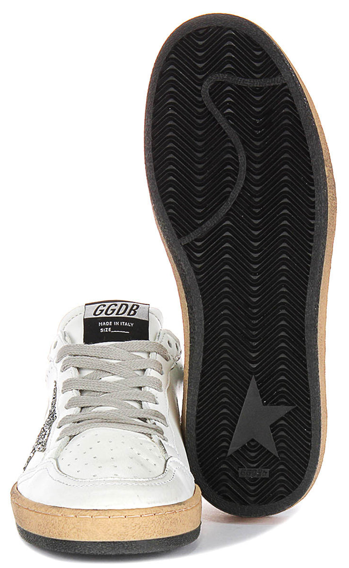 Diseñadas para mujeres que aprecian tanto la moda como la funcionalidad, estas zapatillas descansan sobre una media suela en tono caramelo de inspiración vintage que añade carácter y contrasta bellamente con la parte superior blanca impecable. La suela de goma asegura un agarre confiable y durabilidad, ideal para el uso diario. Los detalles de la marca, incluyendo ‘GGDB/BALLSTAR’ estampado en dorado en el lateral y las letras en negrita ‘S T A R S’ en el talón, reflejan la actitud emblemática de Golden Goose.