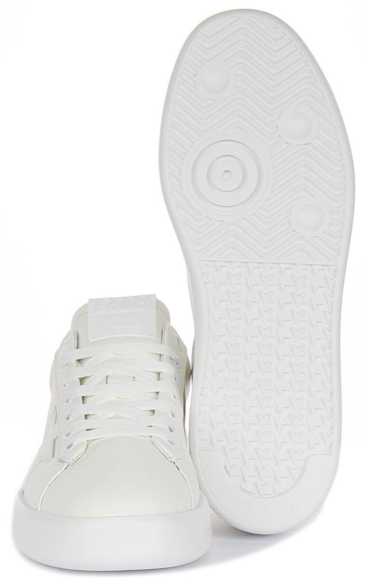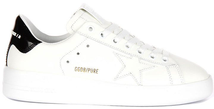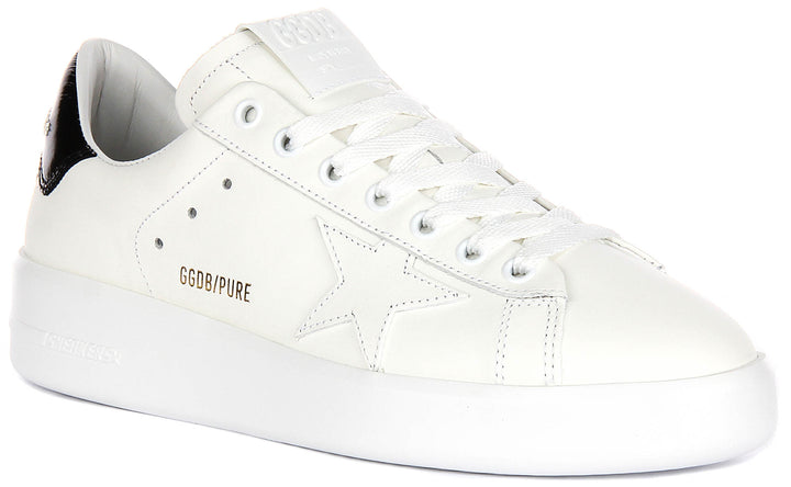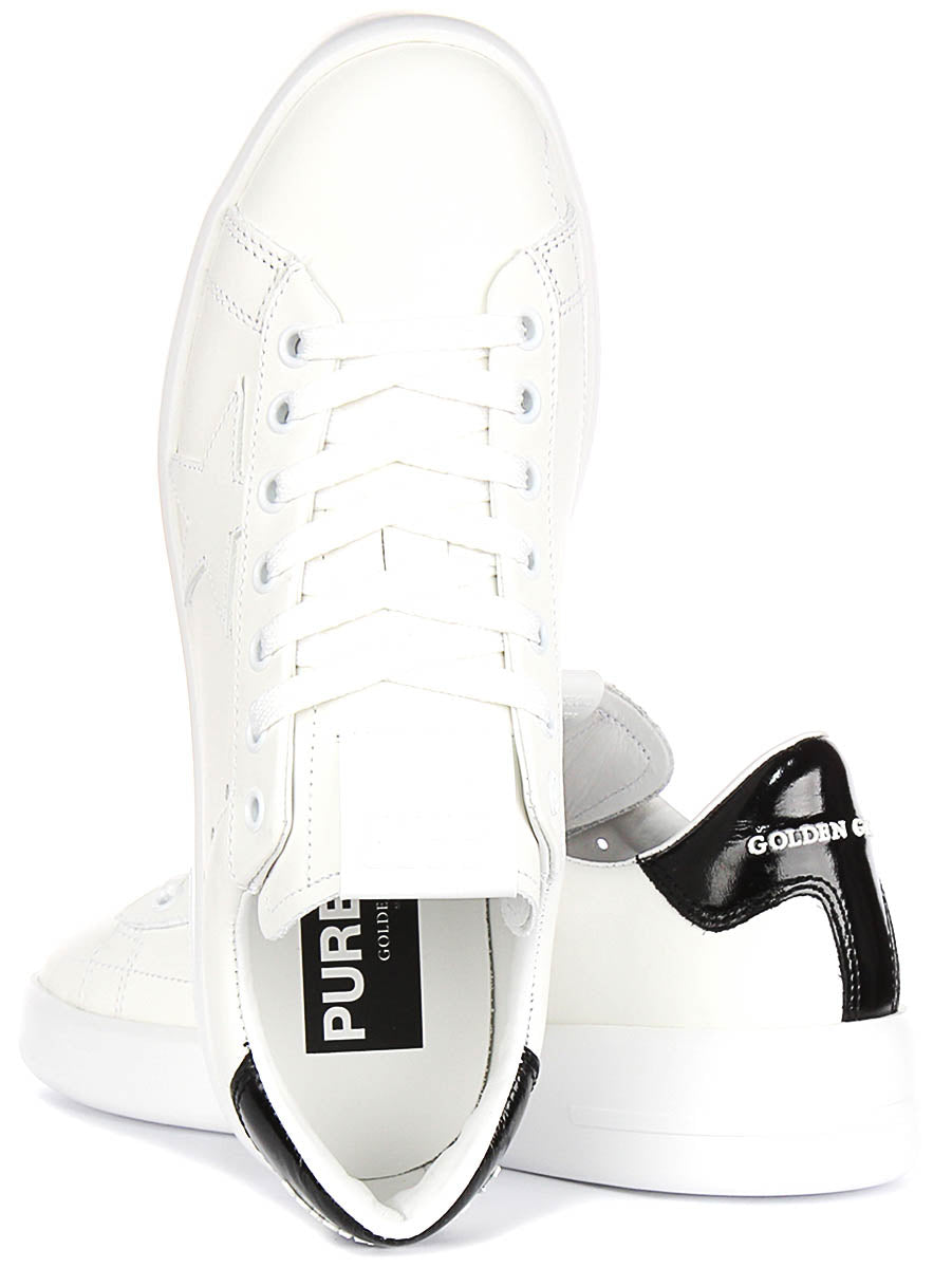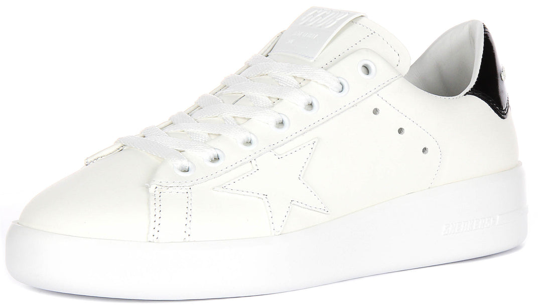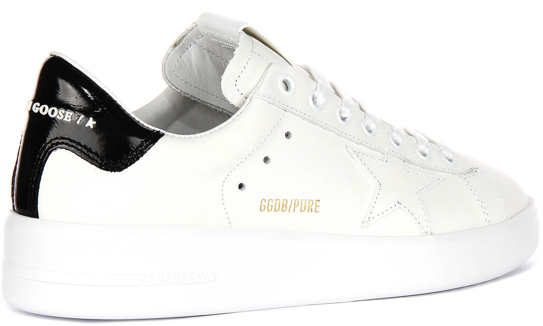 Expertamente confeccionadas con un exterior de cuero liso, las zapatillas Pure New irradian lujo desde todos los ángulos. La parte superior blanca impoluta se realza con detalles sutiles de costuras, incluyendo el icónico motivo de la estrella Golden Goose en el panel lateral. Un toque de sofisticación lo aporta la lengüeta trasera en charol negro, que presenta la marca distintiva de Golden Goose en blanco contrastante, asegurando un acabado chic desde cualquier perspectiva.