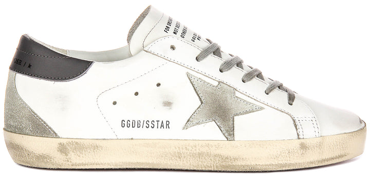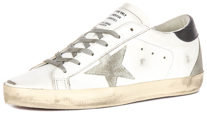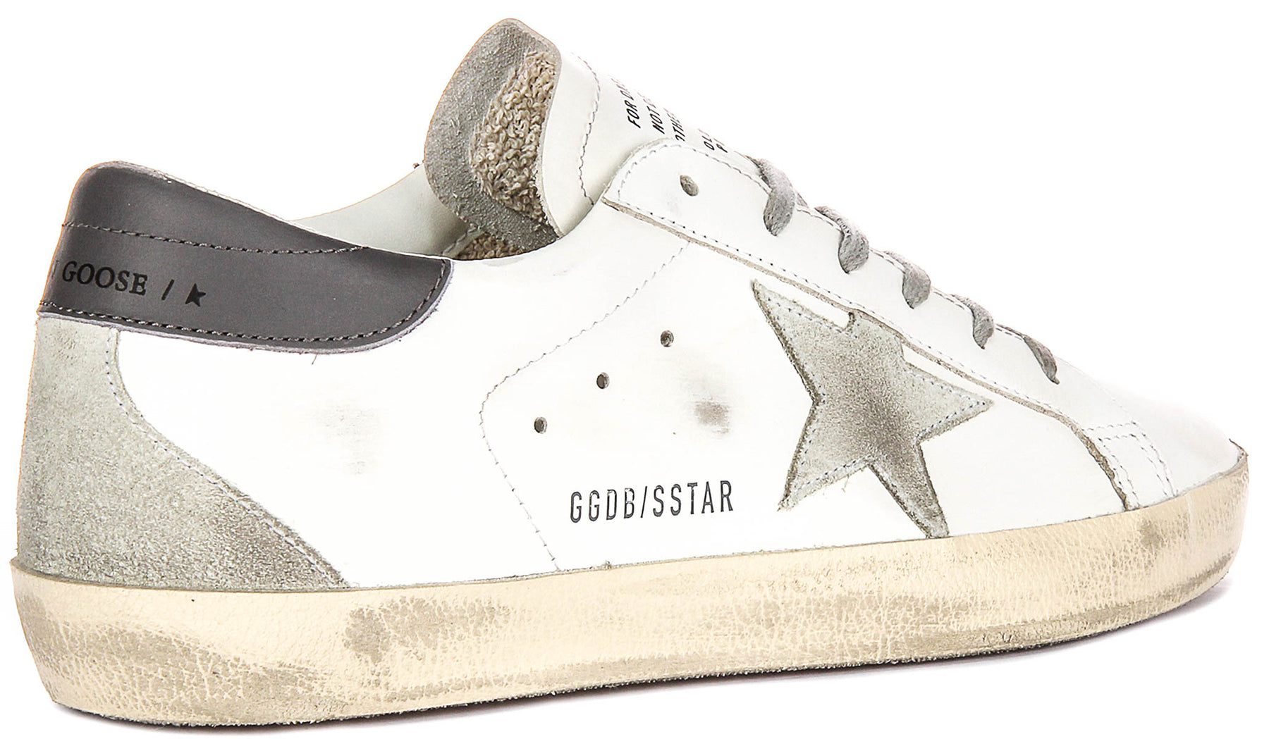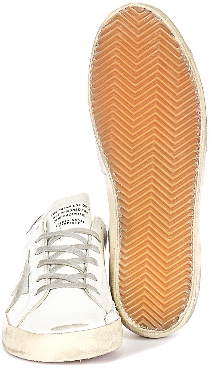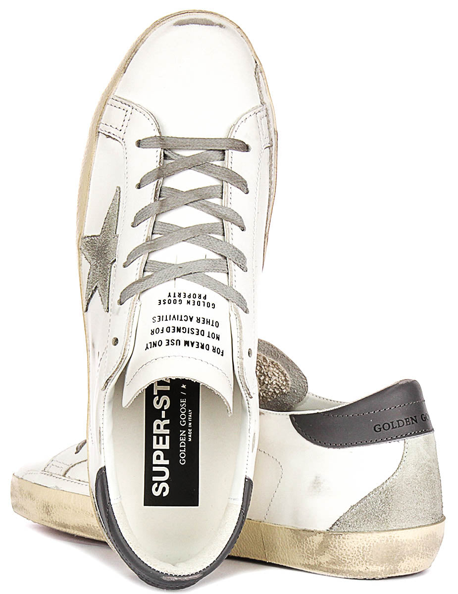 Elaboradas con cuero de primera calidad, las zapatillas Super-star presentan una parte superior blanca impecable, realzada con una aplicación en forma de estrella de gamuza gris en el lateral, icónica de la marca Golden Goose. Los detalles sutiles en gamuza gris en el talón y la estrella, junto con marcas y rozaduras intencionadas en la suela y la parte superior, otorgan a estas zapatillas un aspecto deseado de uso que irradia una frescura sin esfuerzo. El logotipo negro a contraste en la lengüeta del talón y los clásicos detalles perforados completan su apariencia distintiva.