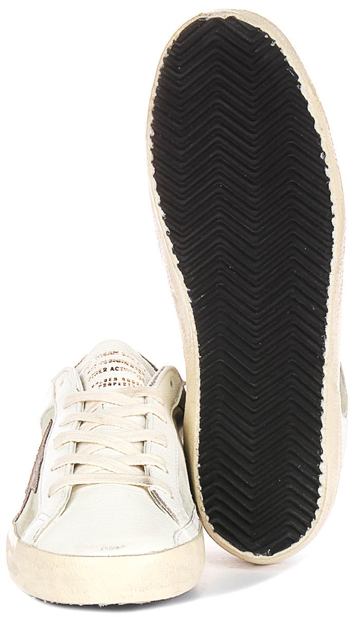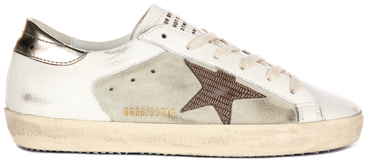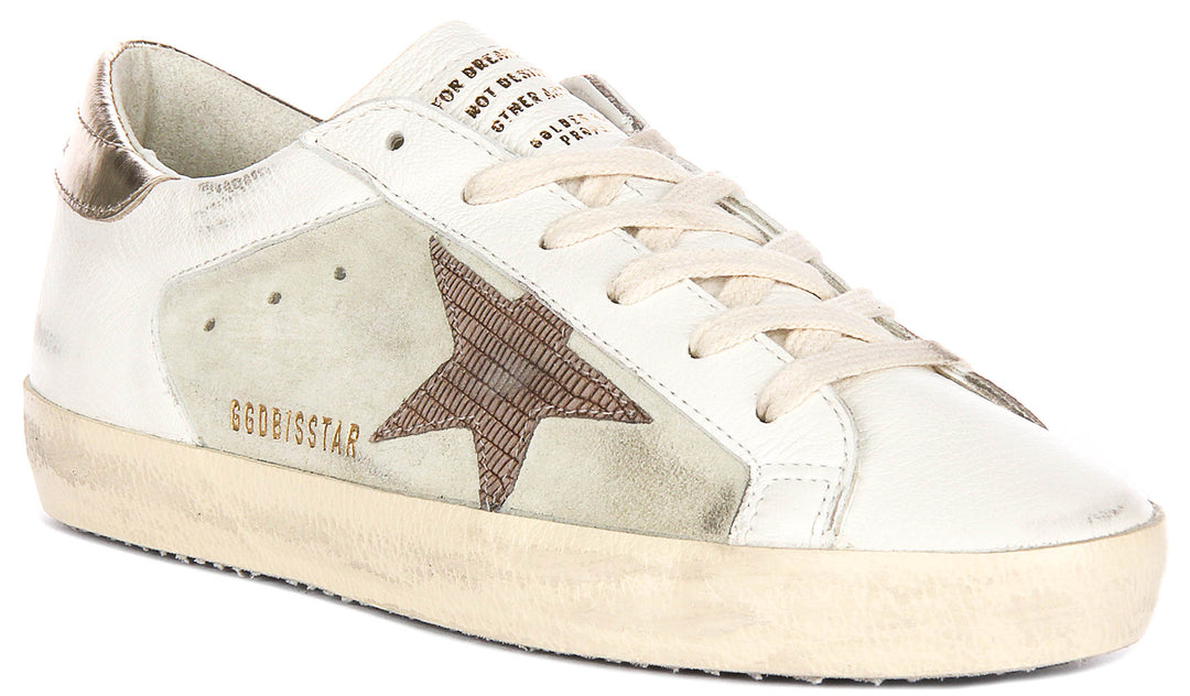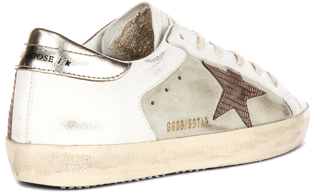 El material exterior está elaborado con lujoso cuero de ante, que ofrece un acabado suave pero resistente que irradia sofisticación. Las zapatillas presentan un tono clásico blanco roto, realzado por un sutil desgaste y un aspecto deliberadamente envejecido para ese codiciado estilo vintage. Un prominente parche de estrella marrón texturizada adorna el panel lateral, identificando al instante las zapatillas como un original Golden Goose, mientras que las letras ‘GGDB/STAR’ en tono dorado añaden un toque extra de estilo de diseñador.