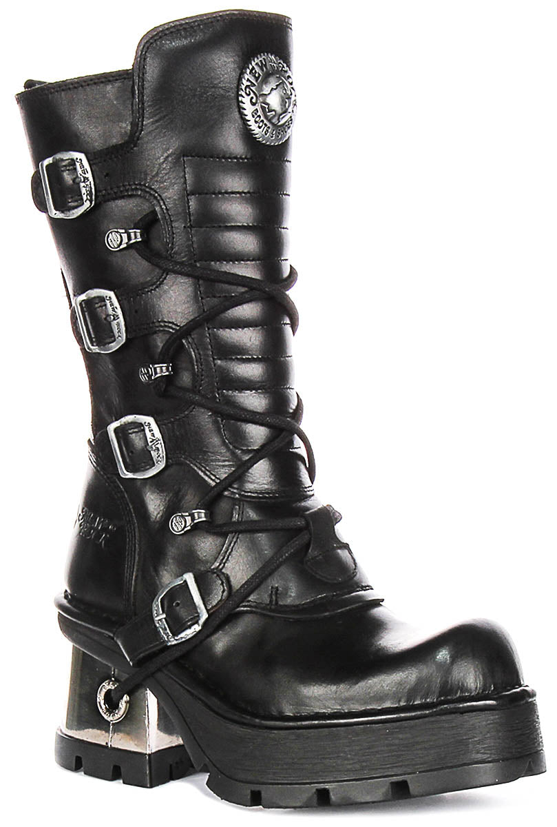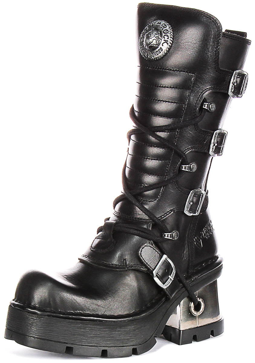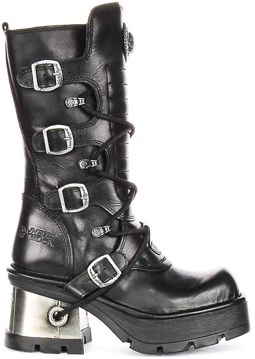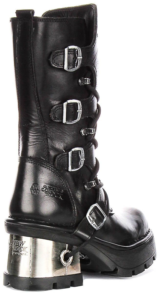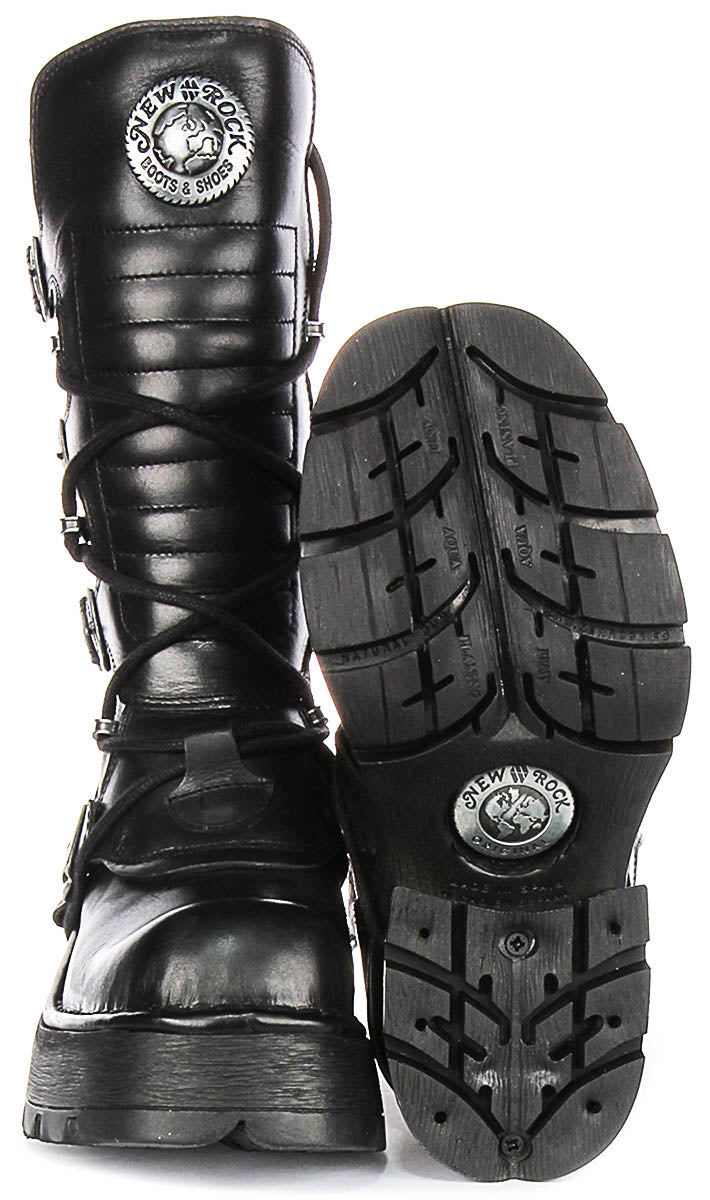 Una de sus características destacadas es la suela de plataforma gruesa con un relieve profundo, que ofrece un agarre y estabilidad excepcionales para uso prolongado. La suela también presenta la marca distintiva de New Rock, añadiendo un toque único a la parte inferior de las botas. El talón reforzado está realzado con un inserto metálico, proporcionando soporte adicional y un detalle visual llamativo que refleja la identidad distintiva de la marca.