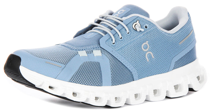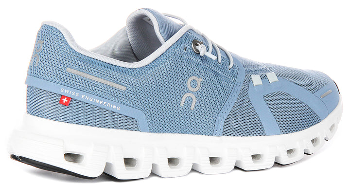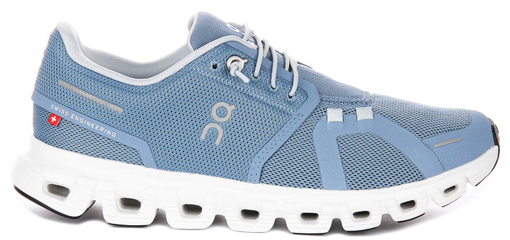 Estas zapatillas presentan un sutil color azul con detalles blancos elegantes y una entresuela blanca nítida, proporcionando una apariencia fresca y limpia que combina fácilmente tanto con ropa deportiva como con conjuntos casuales. El distintivo logotipo de On Running y el sello Swiss Engineering están presentes en los laterales, destacando el compromiso de la marca con la innovación y la calidad.