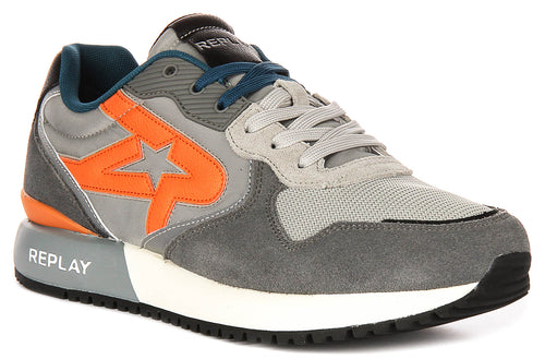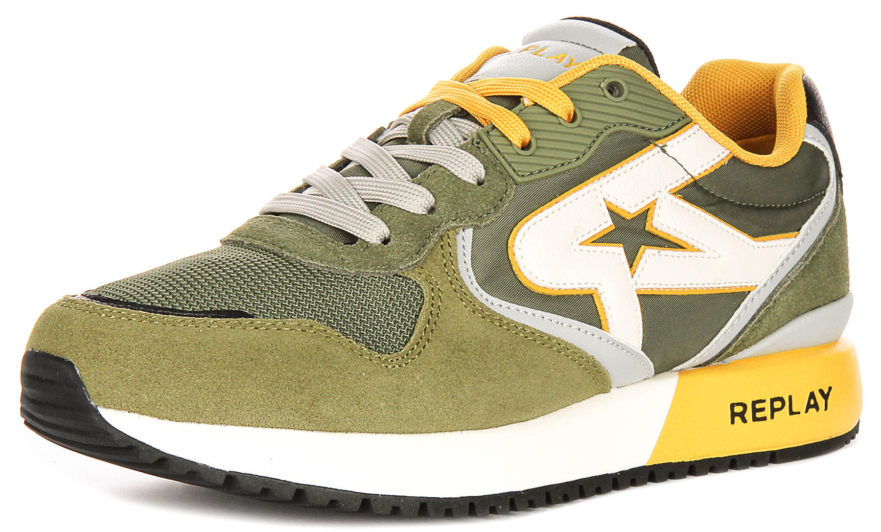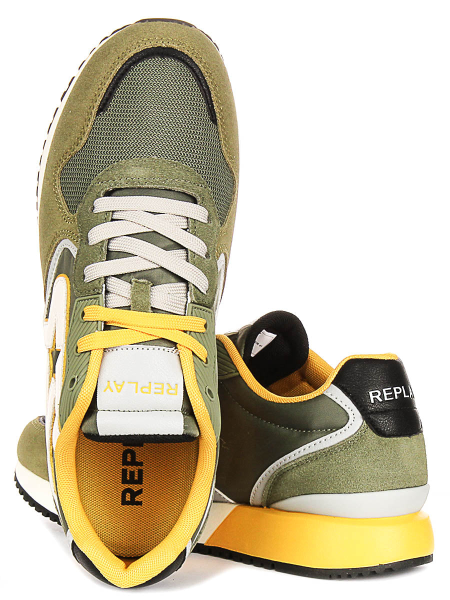 El diseño presenta una armoniosa combinación de colores, predominantemente en tonos verdes tierras con acentos contrastantes. Notarás llamativos detalles en blanco, incluyendo el icónico logotipo de estrella de Replay en el costado, contorneado con un vibrante ribete en naranja que añade un toque de color. Los cordones son bicolores, presentando gris y un brillante amarillo, complementando el esquema de color general. Más abajo, los entrenadores exhiben una media suela blanca con un panel amarillo audaz en el talón, mostrando claramente el nombre de la marca 'REPLAY' en letras negras. Una suela negra completa el look, proporcionando excelente agarre y tracción.