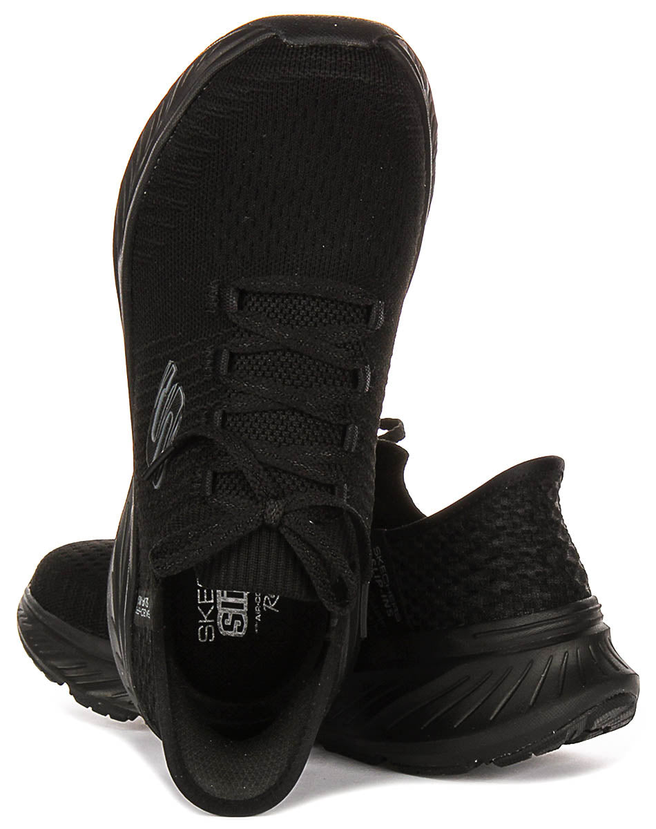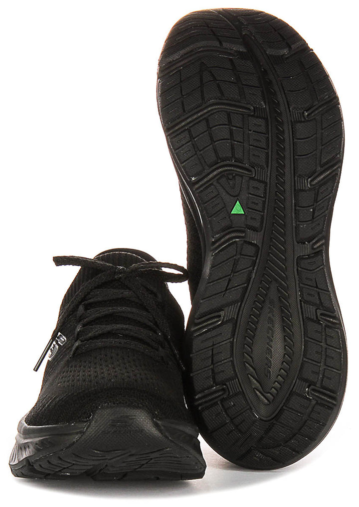 Estas zapatillas presentan un clásico color negro, con sutiles detalles de la marca Skechers y un cierre frontal de cordones tonal para un ajuste seguro. La suela acolchada está diseñada para ofrecer máximo soporte y absorción de impactos, garantizando una pisada suave ya sea que vayas al gimnasio, hagas recados o disfrutes de una caminata rápida.