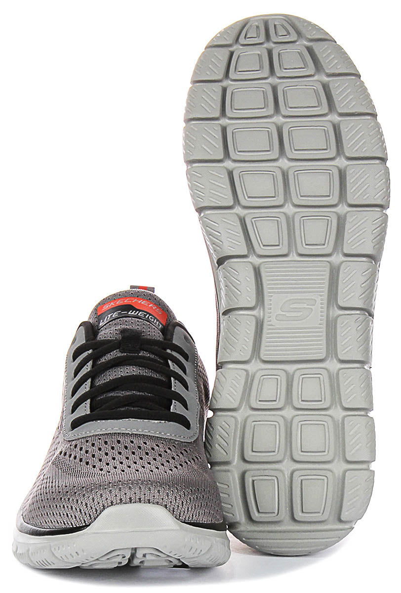 La paleta de colores en gris elegante con detalles en negro y rojo aporta un toque contemporáneo a estas zapatillas. El icónico logo "S" de Skechers en el lateral añade un toque de autenticidad de la marca, mientras que la lengüeta en el talón facilita ponerlas y quitarlas con rapidez. El cierre de cordones garantiza un ajuste seguro, dándote la confianza para avanzar en cualquier entorno.
