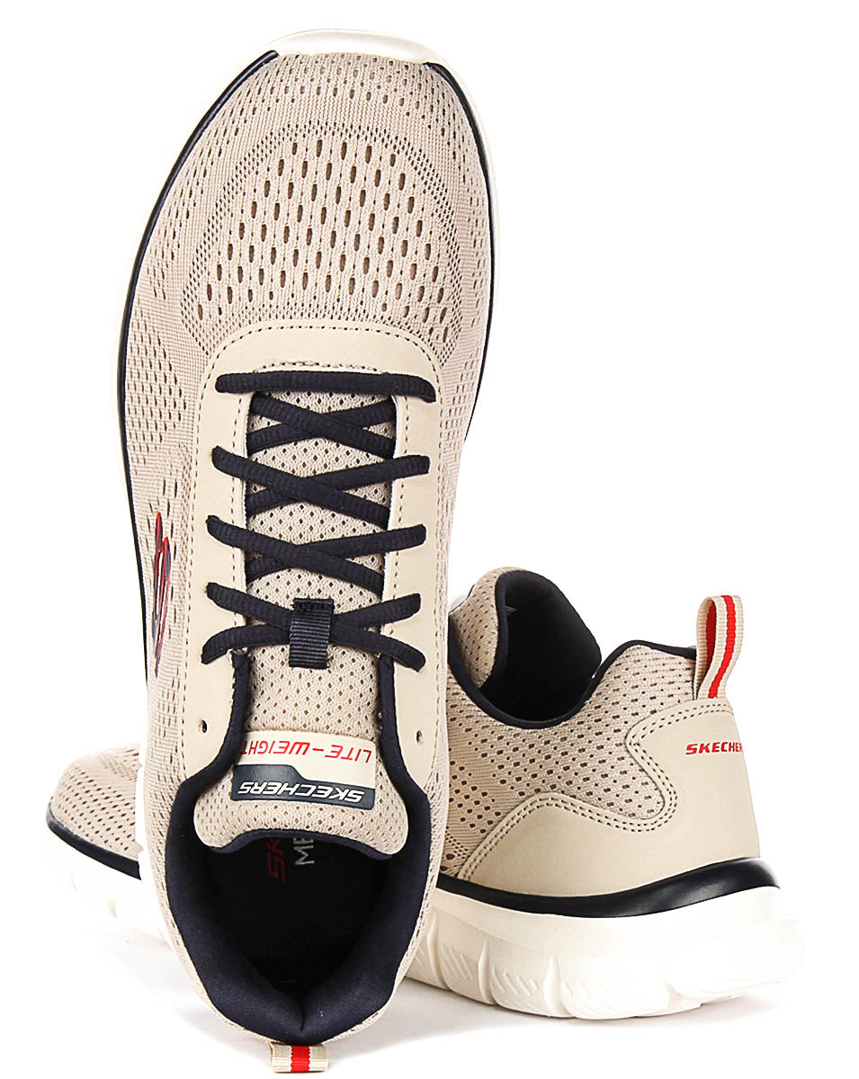 Estas zapatillas están específicamente diseñadas para hombres, con un diseño versátil que combina a la perfección con diversos conjuntos, desde ropa deportiva hasta estilos casuales. El color beige es discreto pero elegante, acentuado con detalles en negro en el cuello y los cordones, así como el audaz logo “S” de Skechers en rojo y negro en los laterales. El sutil contraste aporta un toque de sofisticación deportiva, perfecto para el hombre moderno que valora tanto el rendimiento como el estilo.