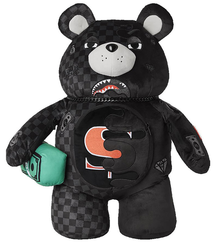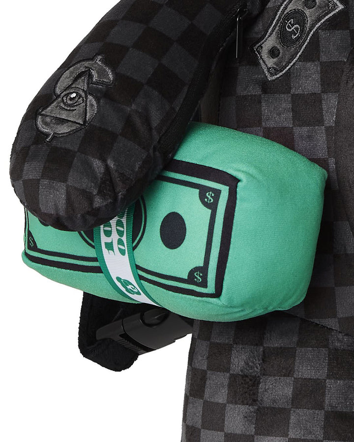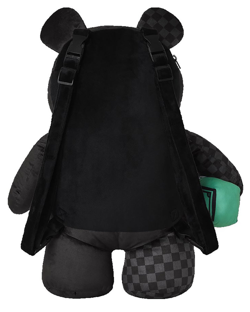 La mochila también incorpora características prácticas, como correas ajustables para un ajuste cómodo, múltiples compartimentos con cremallera para facilitar la organización y un elemento sorpresa de humor: un cojín en forma de billete verde sujetado por el brazo del oso. Esto añade un toque de encanto y funciona también como un compartimento de almacenamiento adicional o cojín.