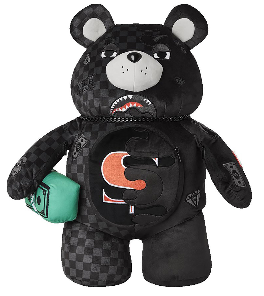 Elaborada con material sintético duradero, la mochila está diseñada para un uso prolongado, manteniendo su estructura y apariencia mullida. Su diseño unisex la convierte en una opción ideal para cualquiera que desee expresar su estilo individual con un toque peculiar. El llamativo color negro incluye un patrón a cuadros entremezclado con los elementos característicos de Sprayground, como el motivo de boca de tiburón y detalles con temática de billetes de dólar. Estos elementos elevan la estética de la mochila, dándole un aire streetwear que conecta con las tendencias contemporáneas.