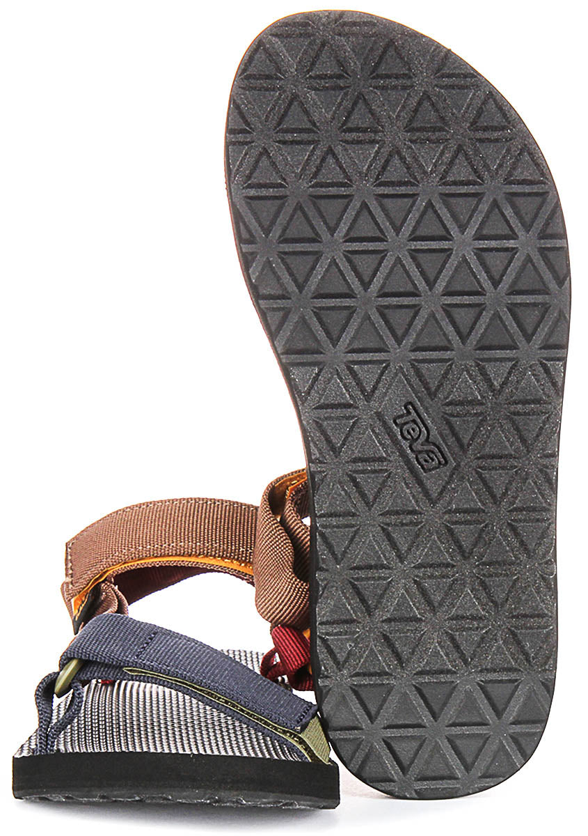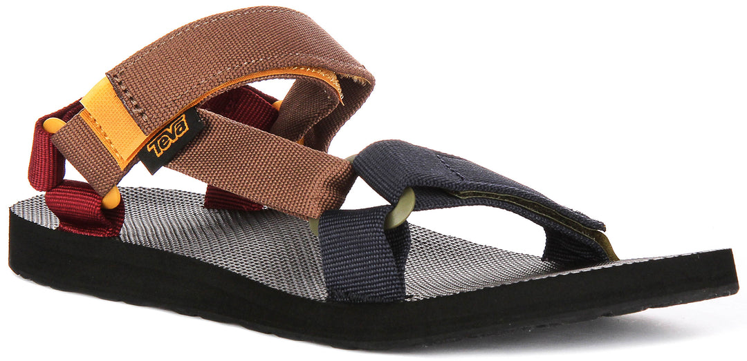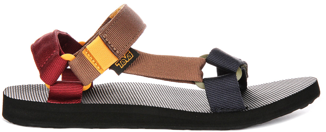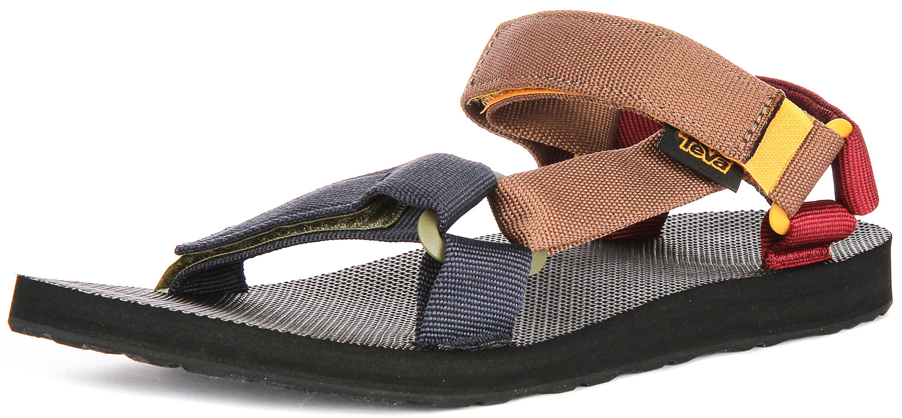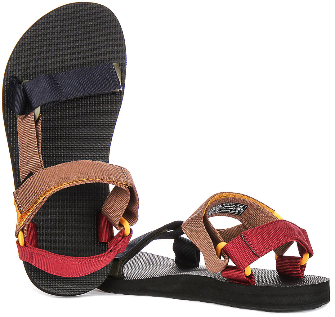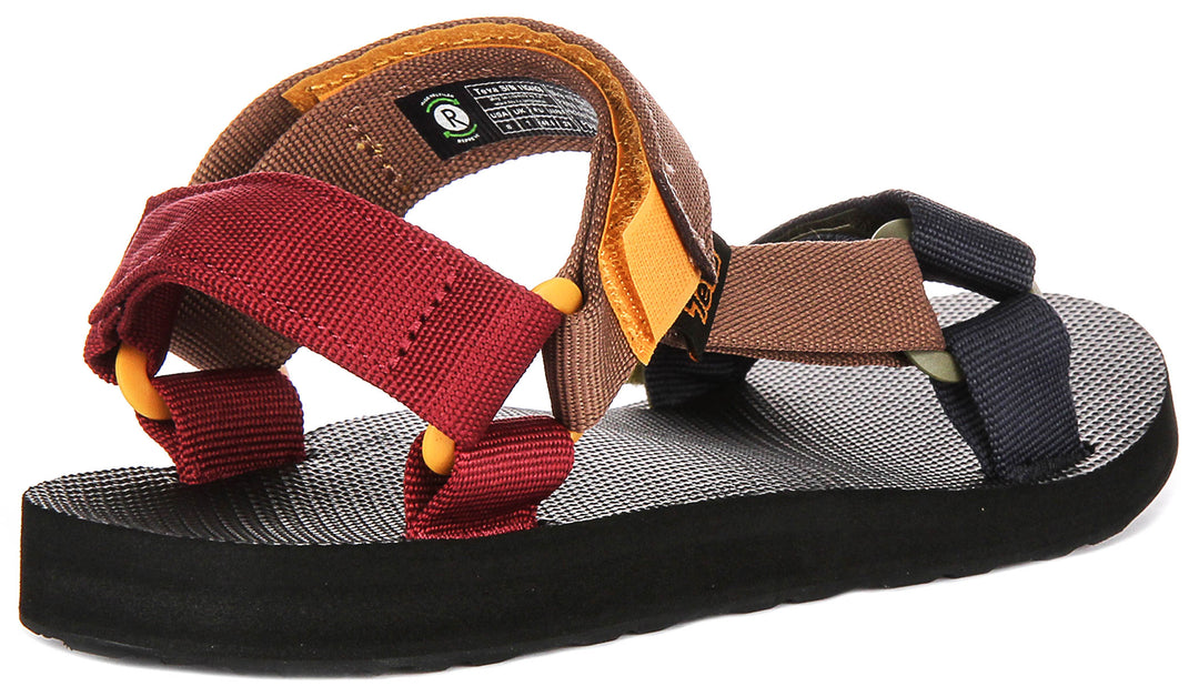Elaboradas con un material exterior totalmente vegano, estas sandalias reflejan el compromiso de Teva con la sostenibilidad sin sacrificar durabilidad ni calidad. Las correas multicolores presentan una combinación distintiva de tonos tierra marrón, burdeos intenso, azul marino profundo y detalles amarillos sutiles, brindando a las sandalias un aspecto moderno y estilizado que destaca manteniendo la facilidad de combinar con una variedad de atuendos.