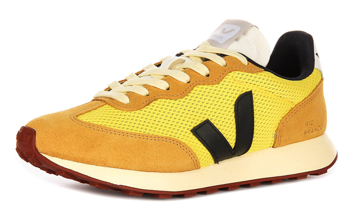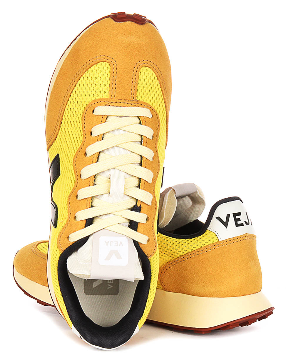 Las zapatillas presentan un diseño exterior elegante hecho con una combinación de ante y malla, ofreciendo un contraste dinámico de texturas. Las superposiciones de ante brindan un acabado premium y durabilidad, mientras que los paneles de malla transpirable garantizan ventilación y comodidad para todo el día. El tono amarillo soleado se complementa perfectamente con matices cálidos de caramelo en el ante y detalles negros llamativos, incluyendo el emblemático logo "V" de Veja en el costado. Esta combinación de colores vibrante pero versátil aporta un toque de energía a tu look, ya sea para hacer recados o salir de manera casual.