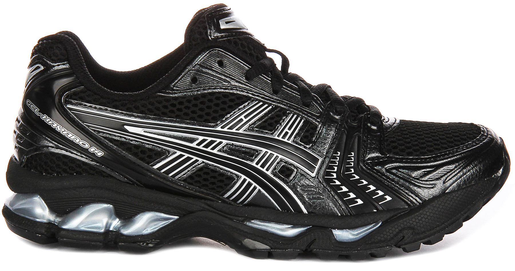 Le design moderne et épuré présente un coloris principalement noir, rehaussé de détails argentés saisissants, conférant à ces chaussures un look à la fois polyvalent et contemporain. Le logo emblématique Asics et le sigle Gel-Kayano 14 sont élégamment apposés sur le côté et le talon, soulignant le patrimoine et la performance de ce modèle.