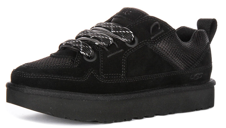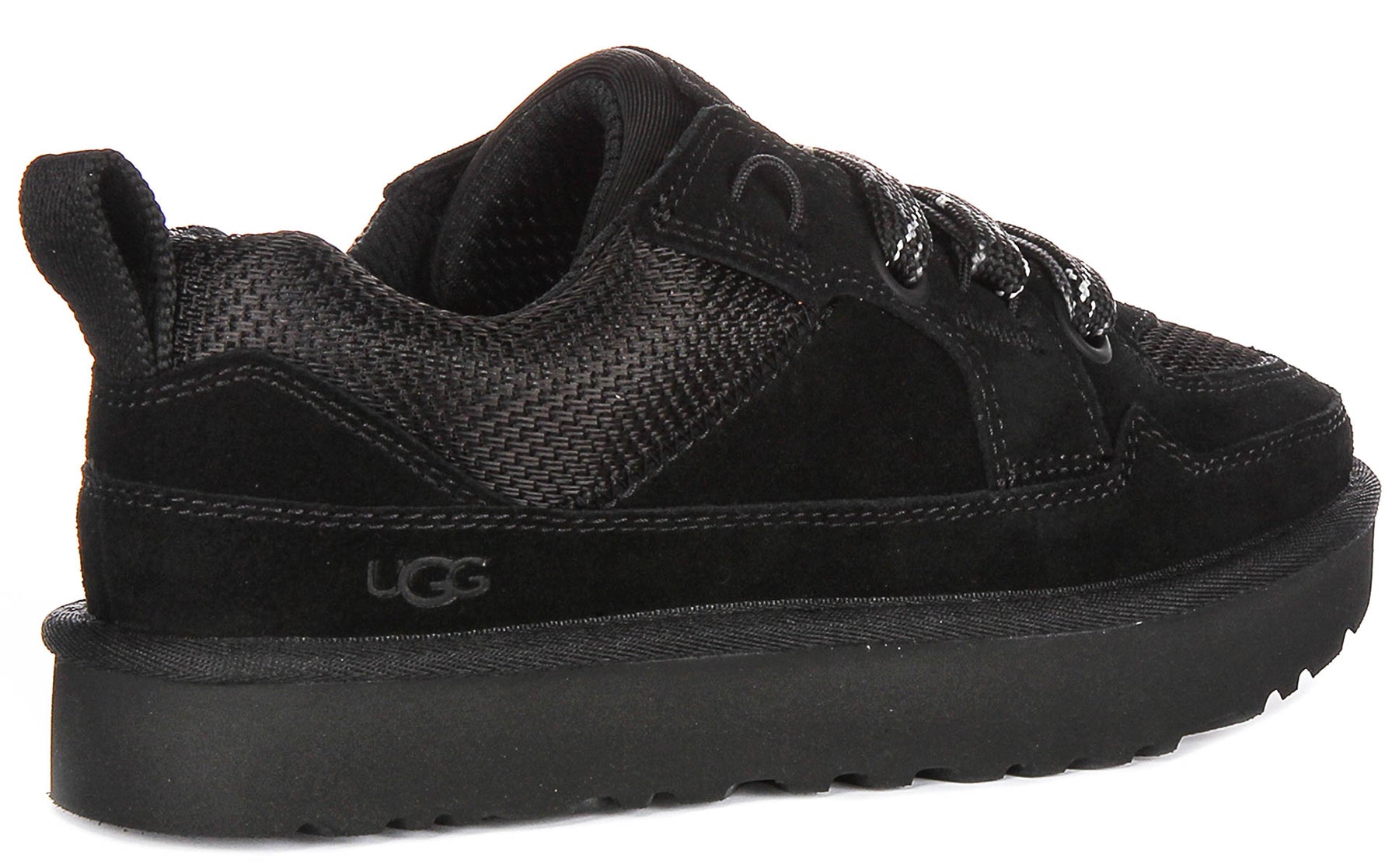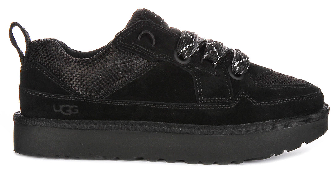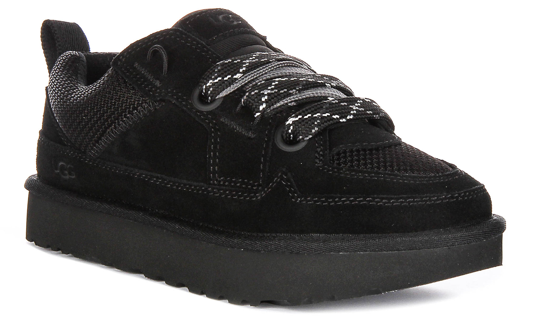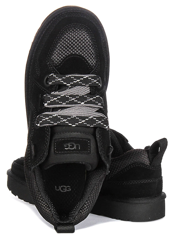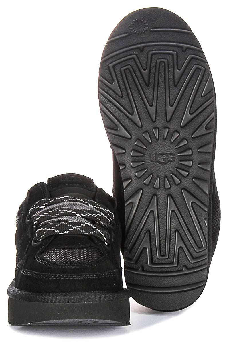 La palette de couleurs entièrement noire ajoute une touche sophistiquée, rendant ces baskets suffisamment polyvalentes pour s'associer à des vêtements de sport comme à des tenues décontractées. Le design à lacets épais présente des lacets larges tissés avec des motifs accentués pour un look distinctif tout en assurant un ajustement sécurisé et réglable. La marque est subtile mais élégante, avec le logo UGG embossé sur le côté et la languette, reflétant l'attention portée par la marque aux détails et à la qualité.