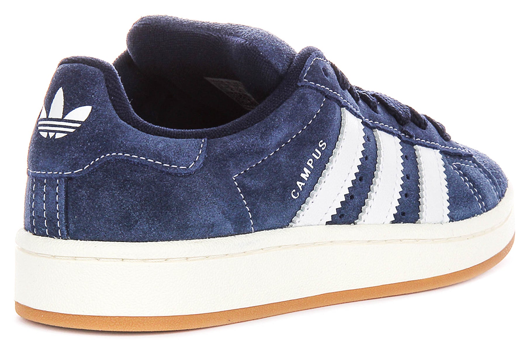 Crafted from premium quality suede leather, the upper provides a luxurious feel and a sophisticated, textured finish. The deep navy hue is beautifully contrasted by crisp white stitching that outlines the paneling and adds a refined touch to the design. A hallmark of Adidas, the three serrated white stripes prominently feature on the side, ensuring instant brand recognition, alongside the 'Campus' script neatly printed in white.