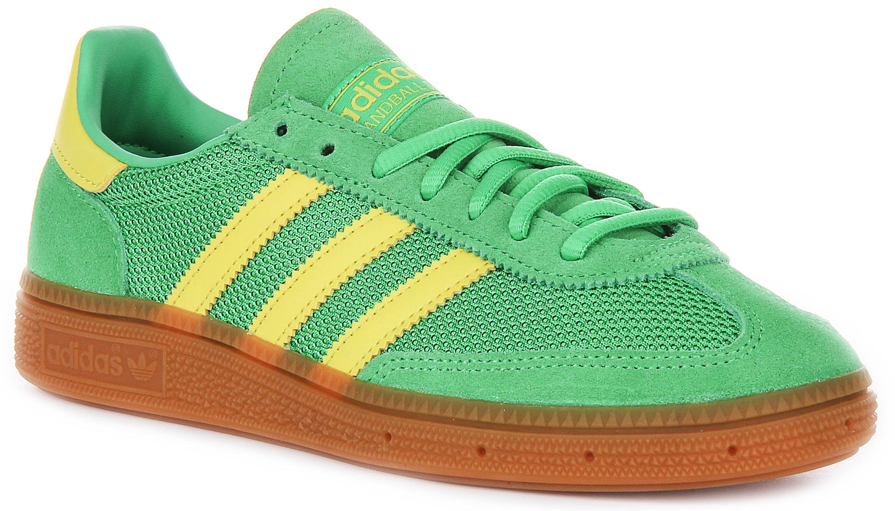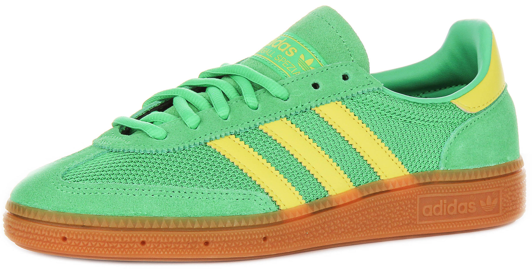 Signature Adidas branding is proudly displayed throughout this design. The iconic three stripes adorn the side in bright yellow, standing out against the green backdrop. A matching yellow patch adds a splash of colour to the heel, while the tongue features the Adidas logo and "Handball Spezia" text, also in yellow, cementing its classic lineage. Colour-matched green laces ensure a snug and adjustable fit.