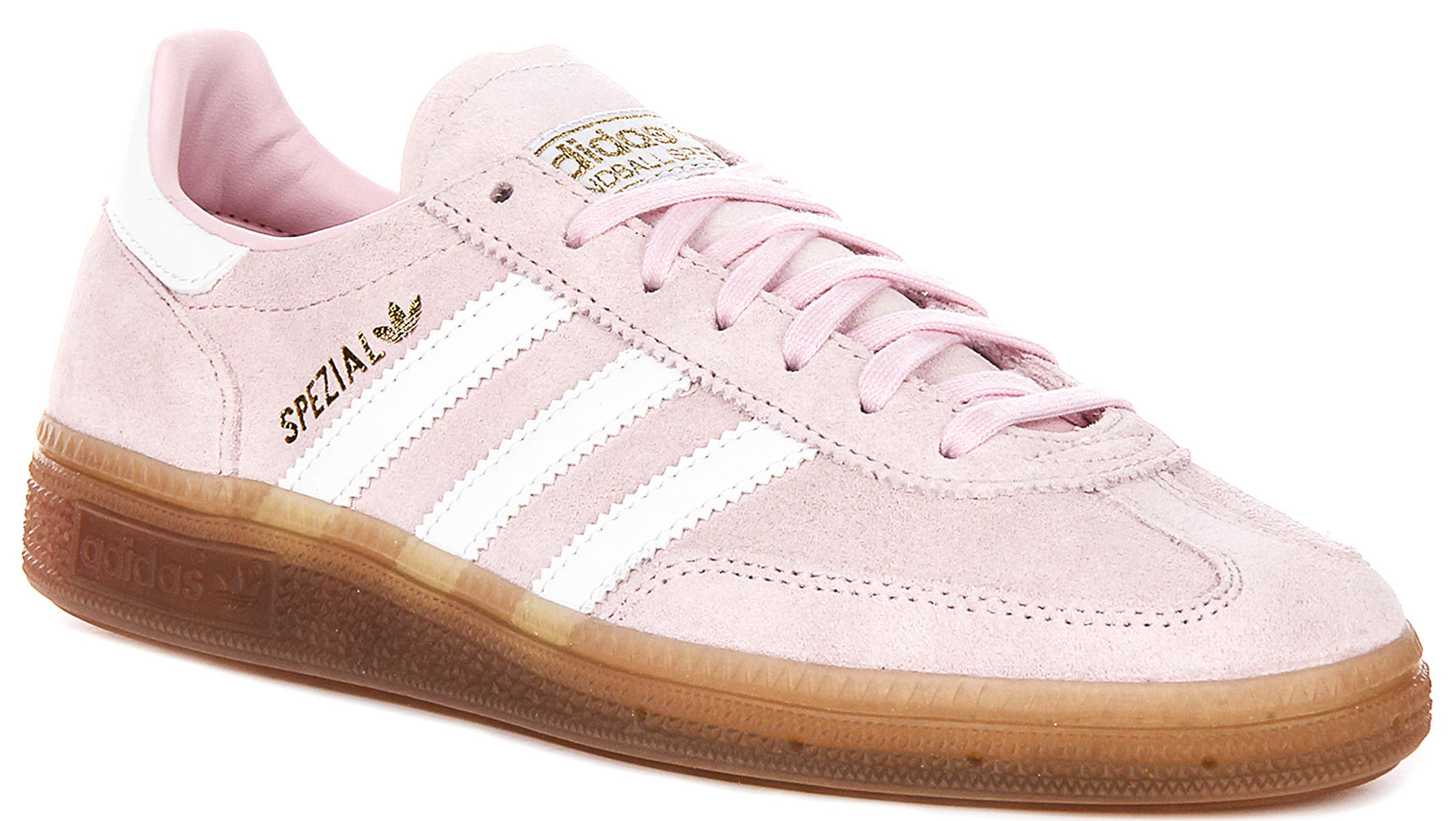 The unmistakable Adidas identity shines through with the crisp white serrated three-stripes adorning the sidewalls, creating a striking contrast against the pink upper. Gold foil 'SPEZIAL' lettering and a delicate Trefoil logo sit proudly alongside, celebrating the shoe's rich handball heritage. A white heel tab further enhances the visual appeal, providing a clean finish to the rear of the shoe, complemented by the Adidas branding on the tongue.