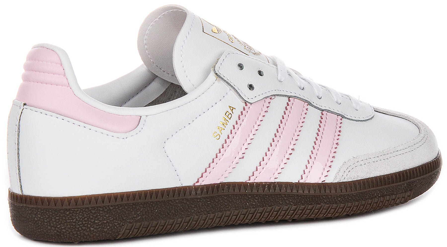 True to the Adidas legacy, the side panels proudly display the signature three stripes in a complementary light pink, which harmonises beautifully with the heel. Adjacent to these iconic stripes, the "SAMBA" lettering is elegantly debossed in gold, highlighting the shoe's storied lineage. The tongue features a classic Adidas trefoil logo, also in gold, reinforcing the brand's authentic identity. The secure lace-up closure ensures a snug and adjustable fit for growing feet.