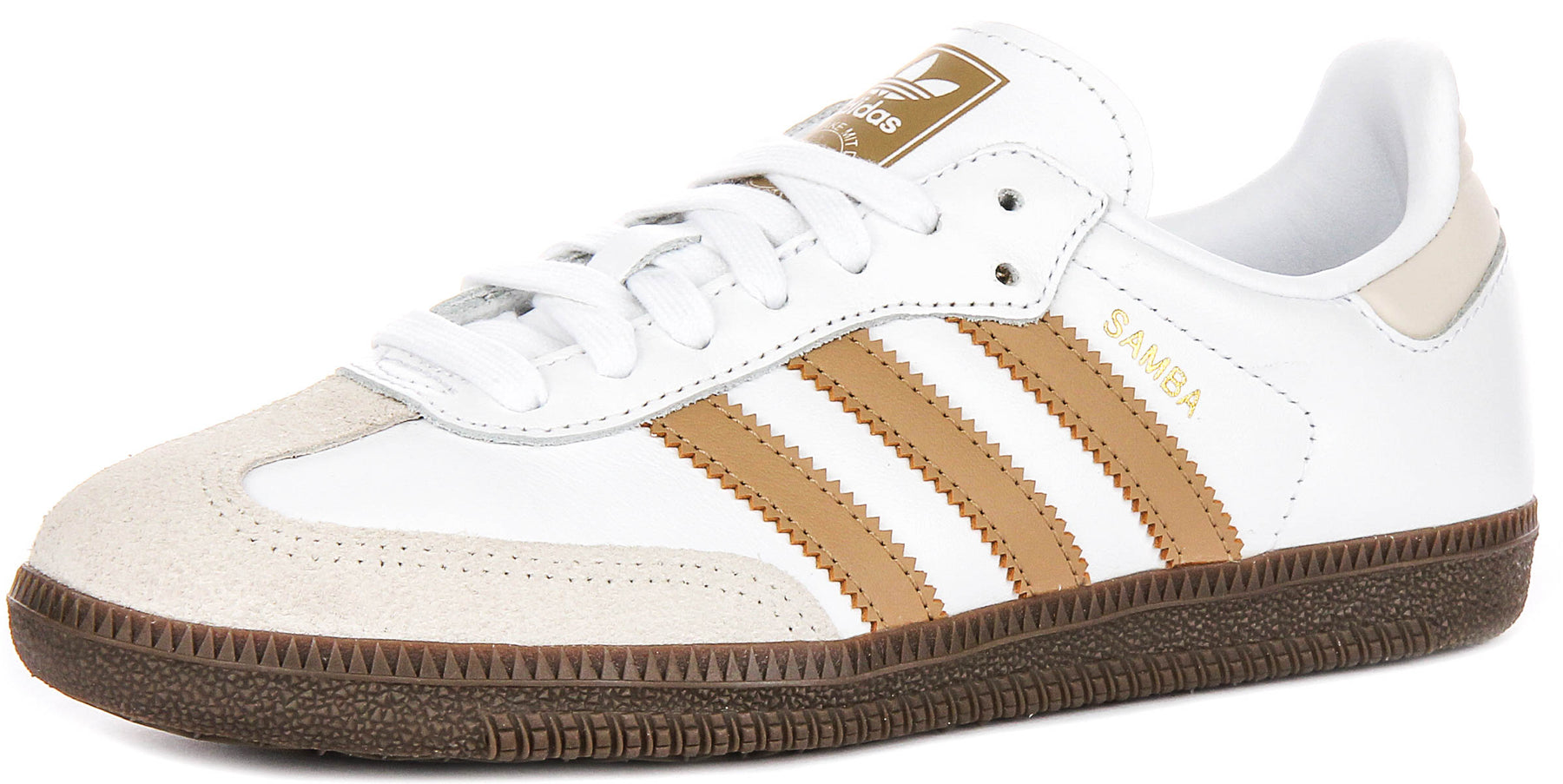 Crafted with a premium white leather outer material, these trainers offer both durability and a sleek, clean aesthetic. The crisp white base is beautifully complemented by the distinctive golden brown three stripes on the side panel, a hallmark of Adidas design, along with matching golden "Samba" lettering that proudly announces its legendary status. Further enhancing the sophisticated look are the light beige suede overlays on the T-toe and a subtle light beige leather heel tab, adding texture and depth to the overall design.