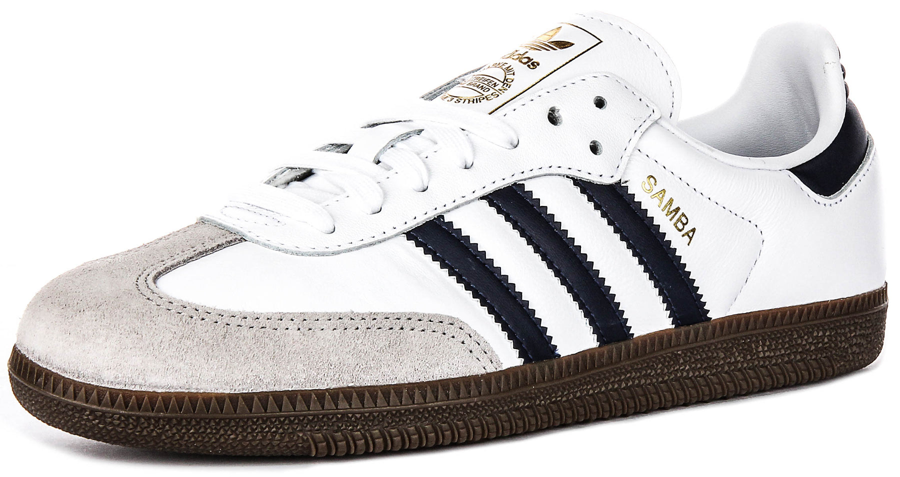 The Adidas Samba Og W features the signature three-stripe design in a contrasting dark navy, set against a clean white base for a striking visual appeal. The elegant gold “SAMBA” lettering on the side and the gold-branded tongue add a subtle touch of luxury, elevating the overall look of these trainers. A soft suede toe cap not only enhances the design but also provides extra durability in high-wear areas.