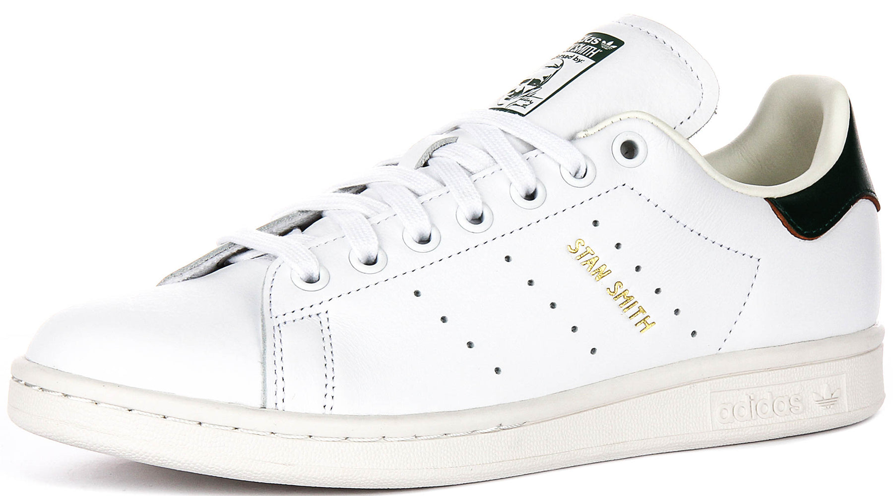 These trainers feature a comfortable padded collar and tongue, as well as a cushioned insole for all-day comfort. The heel tab is highlighted in a rich green shade with the Stan Smith logo, giving the shoes a subtle yet stylish accent. The flat white laces and classic rubber sole with a textured grip pattern ensure both secure fitting and reliable traction.