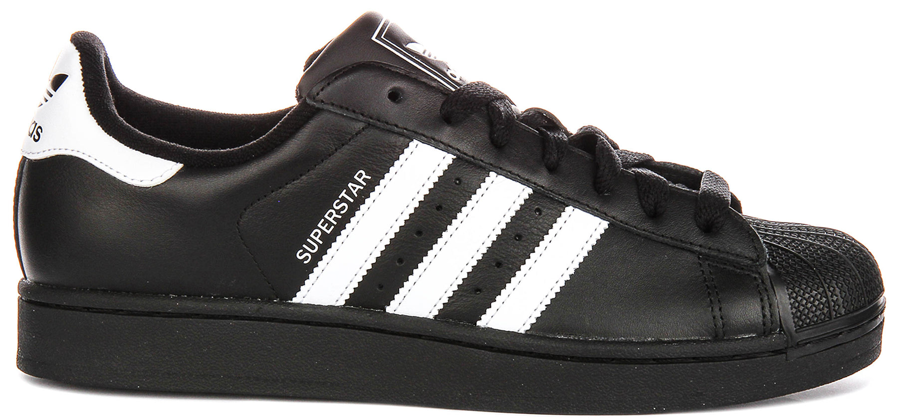 Crafted with a premium black leather outer material, these trainers offer a sophisticated and durable finish. The deep black hue provides a versatile base, beautifully contrasted by crisp white accents. You'll find the signature Adidas three stripes prominently displayed in white along the side panel, perfectly complemented by the white 'SUPERSTAR' lettering, adding to their unmistakable identity.