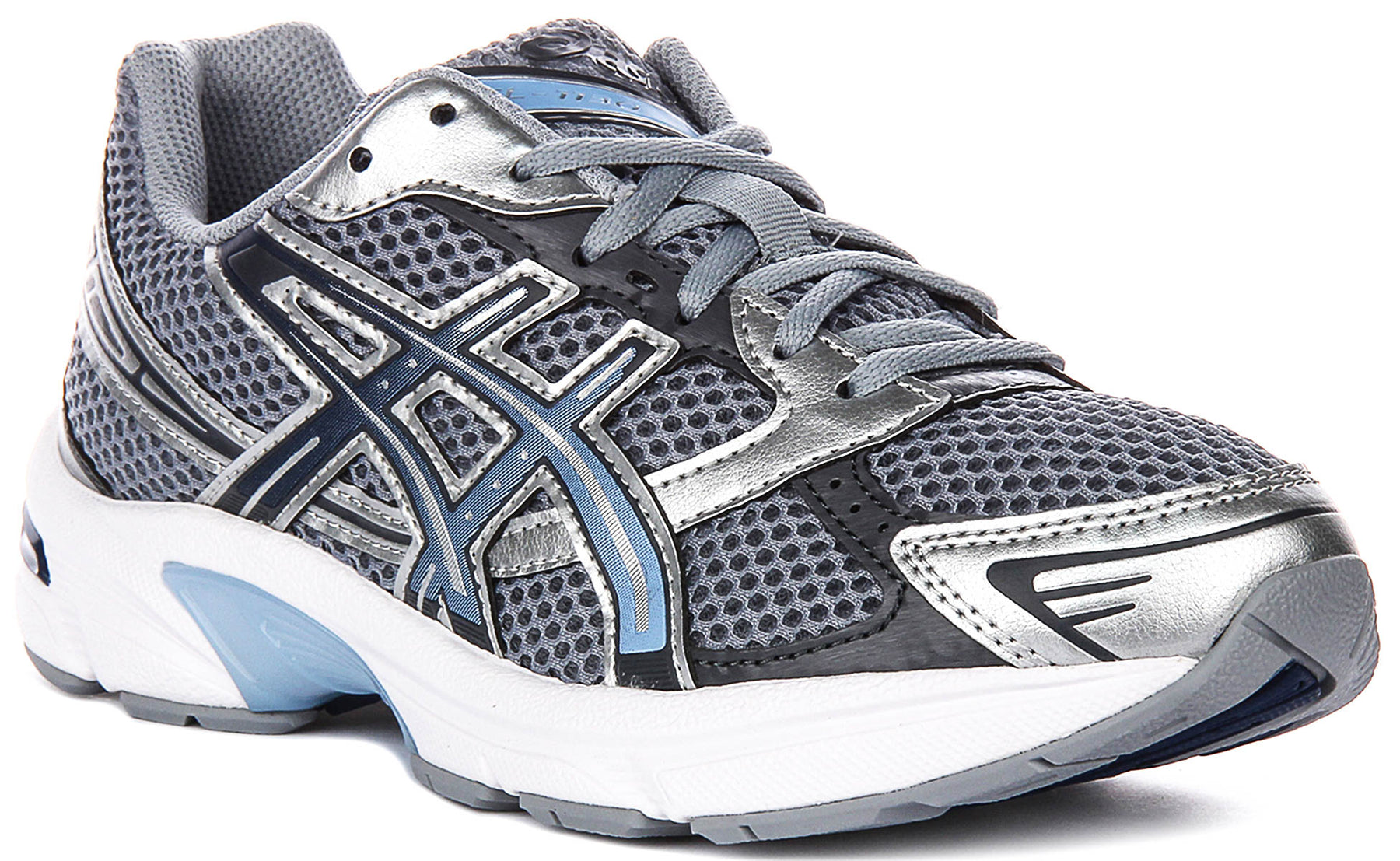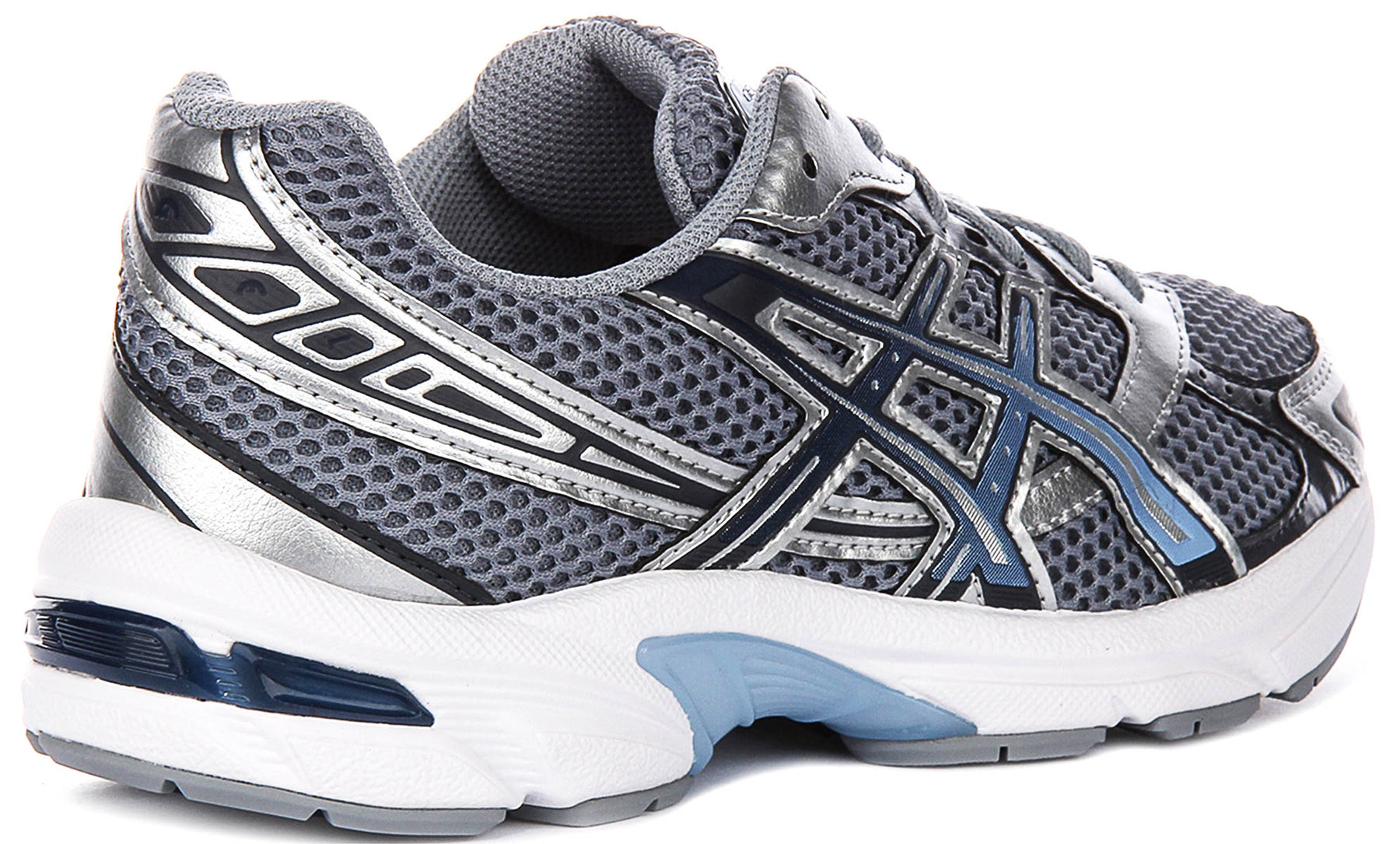 The upper of the GEL-1130 trainers features a breathable grey mesh outer material, ensuring optimal airflow to keep your feet cool and comfortable throughout the day. This is complemented by striking metallic silver overlays that provide essential structural support and a distinctive, sleek aesthetic. Further black accents add depth to the design, while the iconic Asics tiger stripes stand out with a blend of dark and light blue, injecting a vibrant pop of colour. The grey laces seamlessly integrate with the overall colour scheme, completing a look that is both modern and rooted in classic running shoe design.