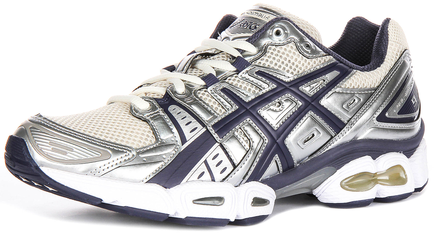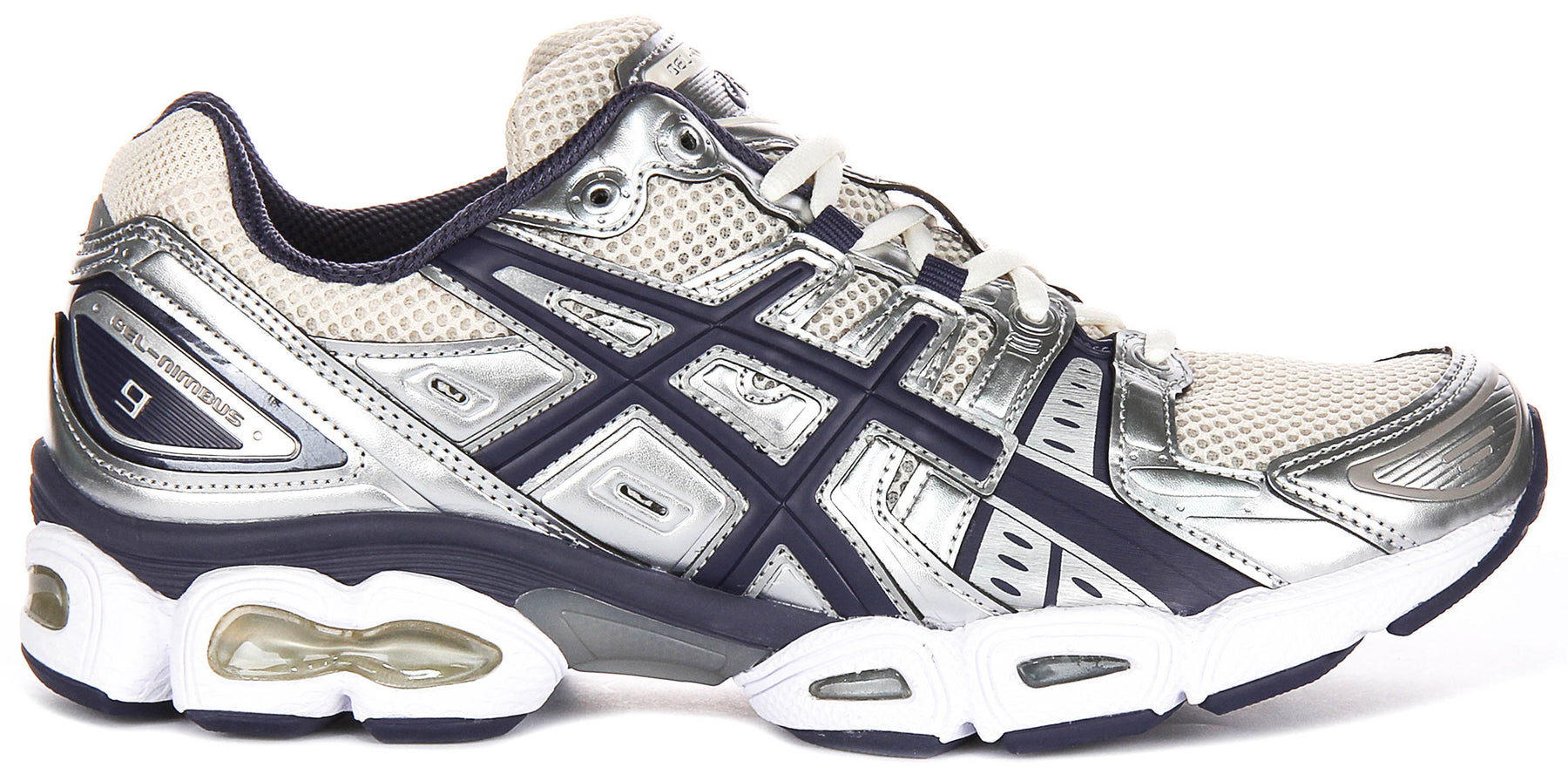 The outer material is a high-quality combination of suede and mesh, providing a premium look while ensuring breathability and flexibility. The suede accents offer a touch of luxury, while the mesh panels allow for excellent airflow, keeping your feet cool and comfortable during long wear. The trainers are finished in a sophisticated palette, combining metallic silver overlays with dark navy accents and subtle off-white mesh for a truly eye-catching appearance.
