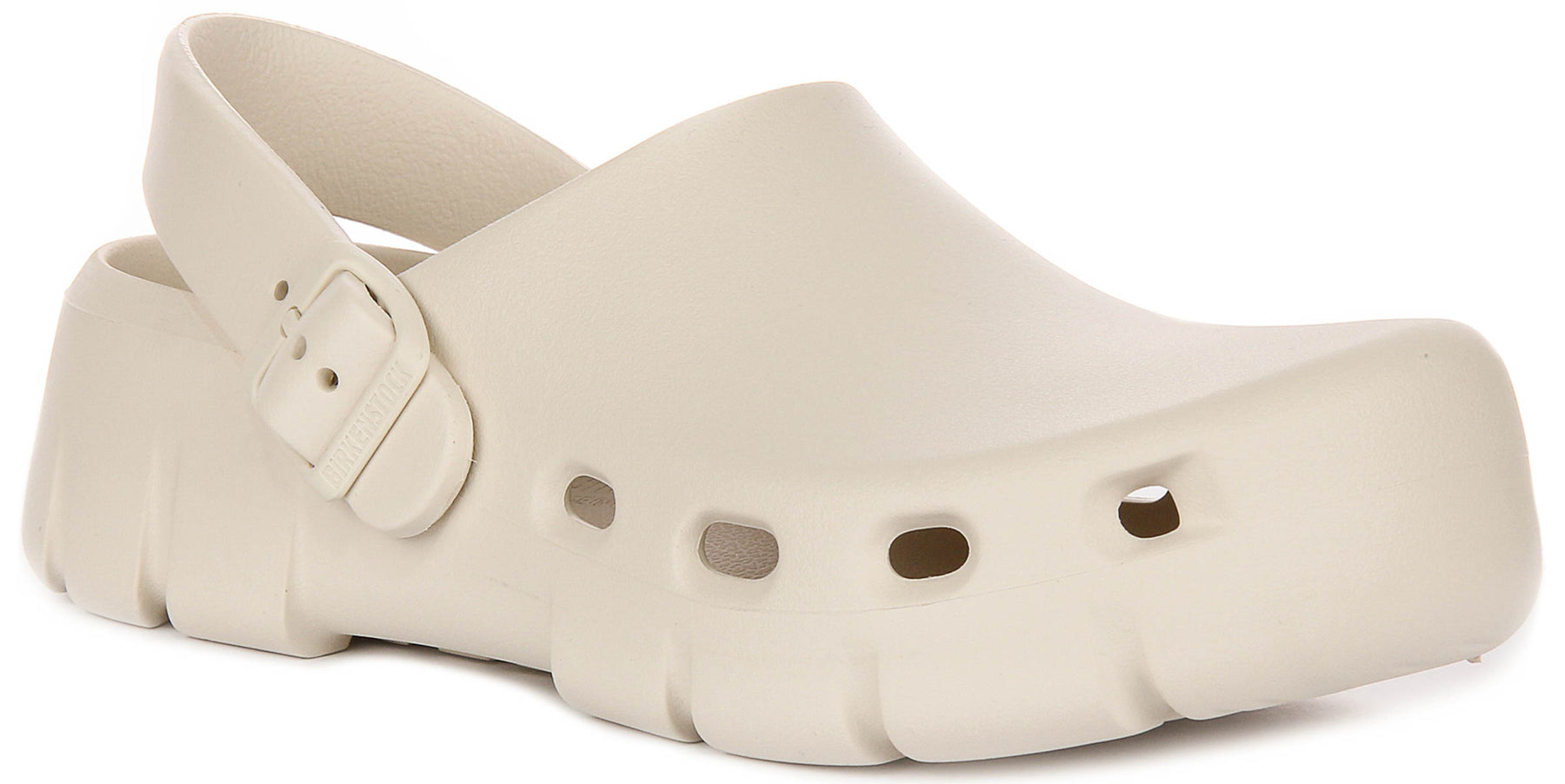 Discover the Birkenstock Birki Flow Eva clogs, a versatile and comfortable footwear option designed for everyday wear. These unisex clogs are expertly crafted from a high-quality, lightweight rubber EVA material, presented in a sophisticated, neutral shade of light beige that complements a wide range of outfits.