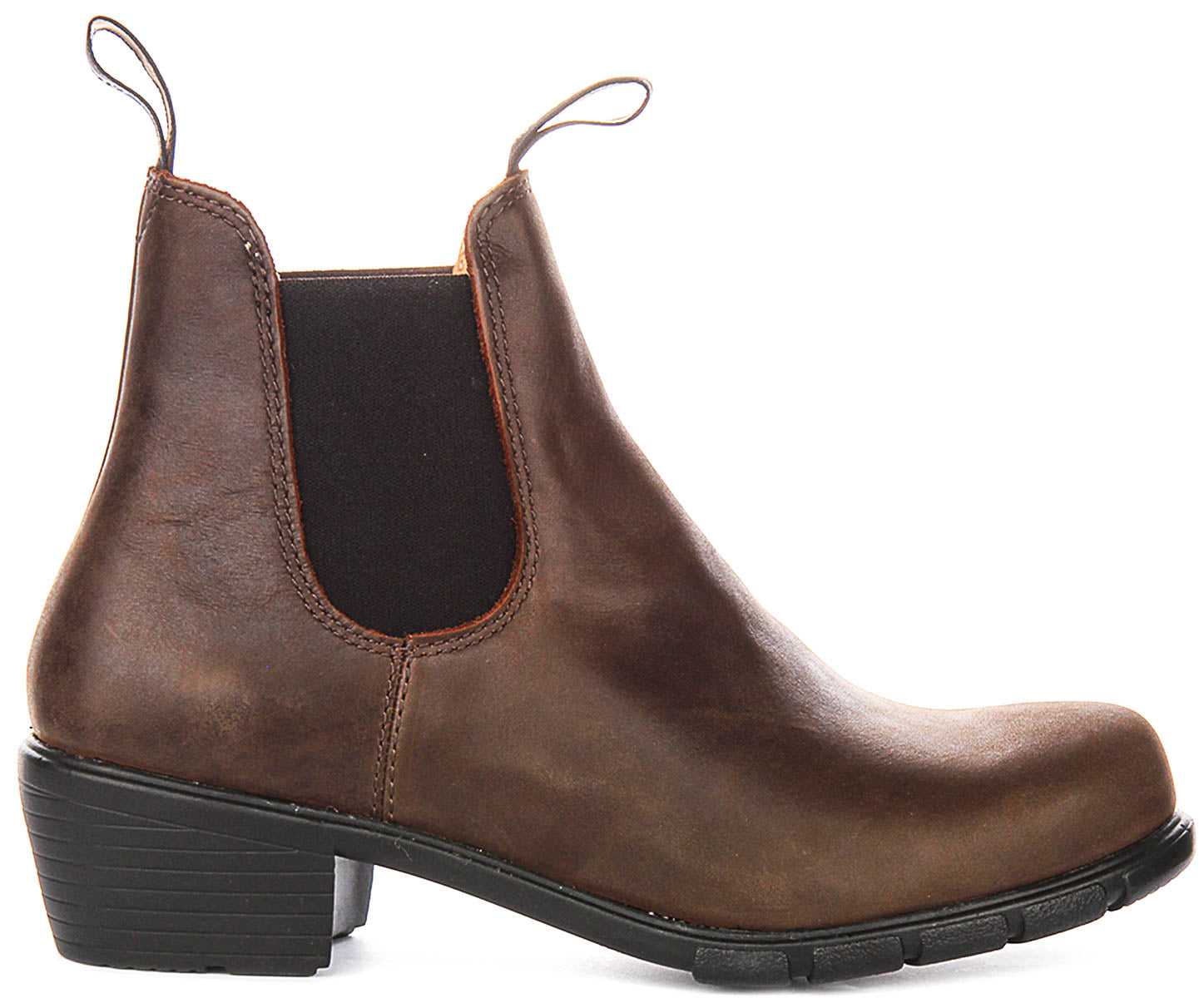 Designed with both aesthetics and practicality in mind, these boots are elevated by a comfortable yet stylish block heel in black, offering a subtle lift without compromising stability. The robust black outsole features a distinct multi-directional tread pattern, ensuring reliable grip and traction across various surfaces. The Blundstone branding is discreetly embossed on the sole, confirming the boot's quality and heritage.