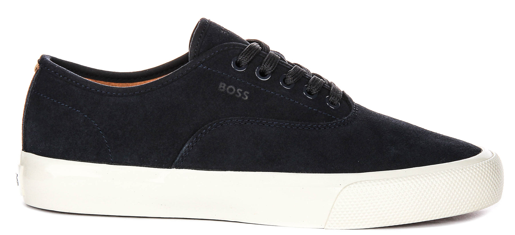Constructed with a luxurious suede leather outer material, these trainers exude a premium look and feel. The rich dark navy hue, subtly contrasted by a crisp white rubber sole, creates a versatile aesthetic that pairs effortlessly with both smart and casual ensembles. The understated Boss branding on the side and heel further adds to the refined yet distinctive appearance.