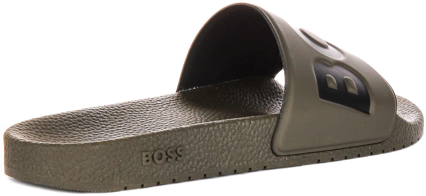 Designed specifically for men, the Aryeh Slid stands out with its bold BOSS branding prominently displayed across the wide strap, showcasing a sense of premium style. The earthy olive-green tone is versatile and understated, easily pairing with a variety of casual outfits.