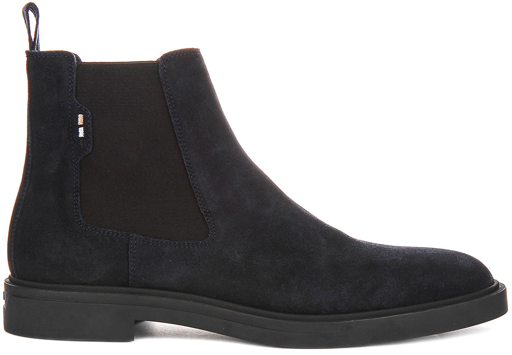 Practicality meets panache with thoughtful details such as the sturdy fabric pull tab located at the rear of the boot, aiding in easy wear. The robust, yet streamlined, black sole offers reliable grip and durability, complementing the elegant upper without detracting from its sophisticated look. Subtle Boss branding is discreetly incorporated, including a small signature flag detail on the outer elasticated panel and embossed branding on the sole and heel, affirming their premium heritage.