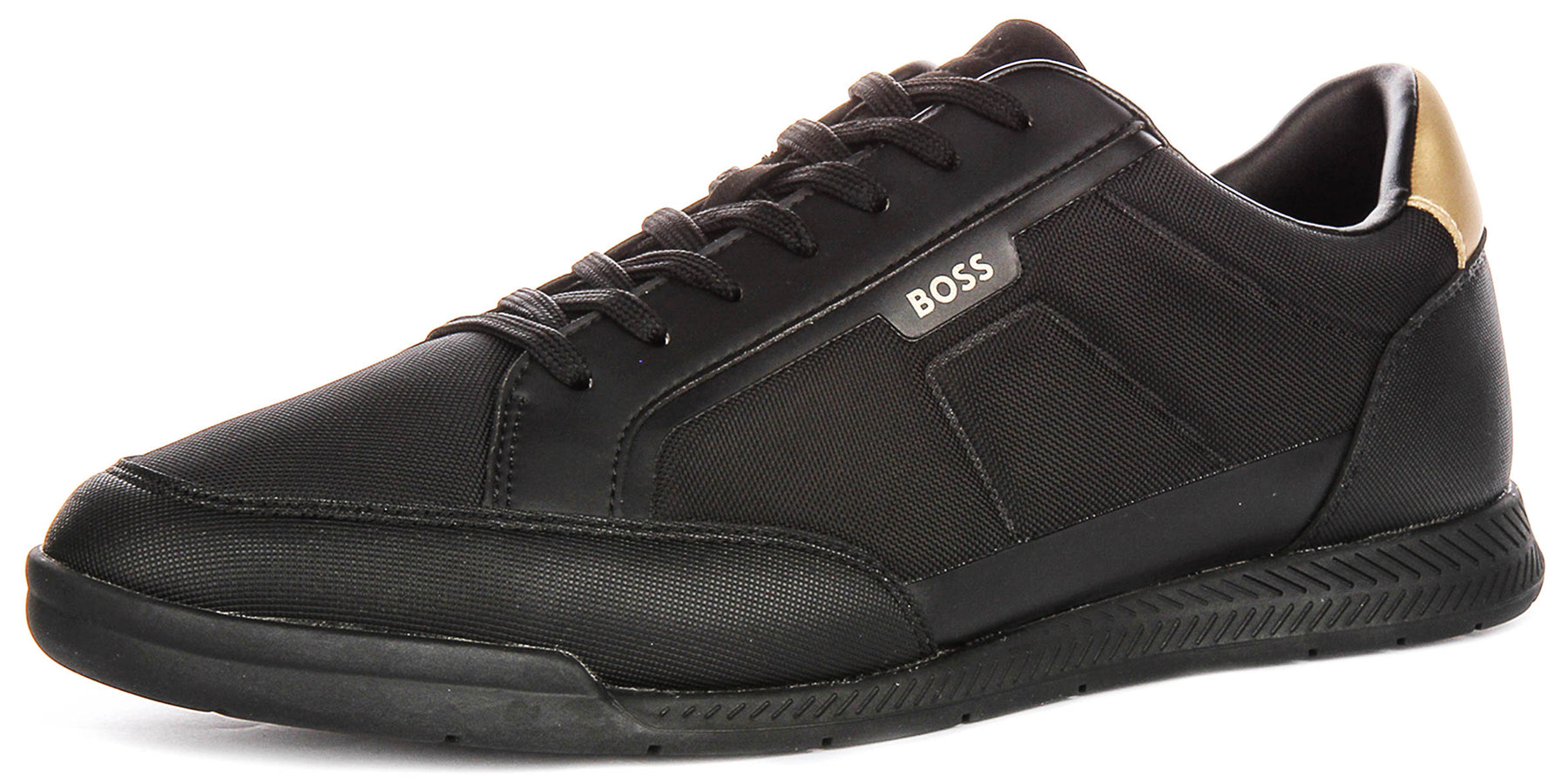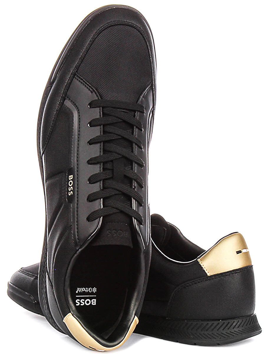 Presented in a striking all-black colourway, these trainers exude understated elegance. A distinctive metallic gold accent on the heel tab adds a touch of luxury and visual interest, complete with a subtle striped detail for an elevated touch. The iconic Boss branding is discreetly placed on a black and silver plaque on the side, while further branding is visible on the insole and embossed on the durable outsole, confirming their authentic designer appeal.