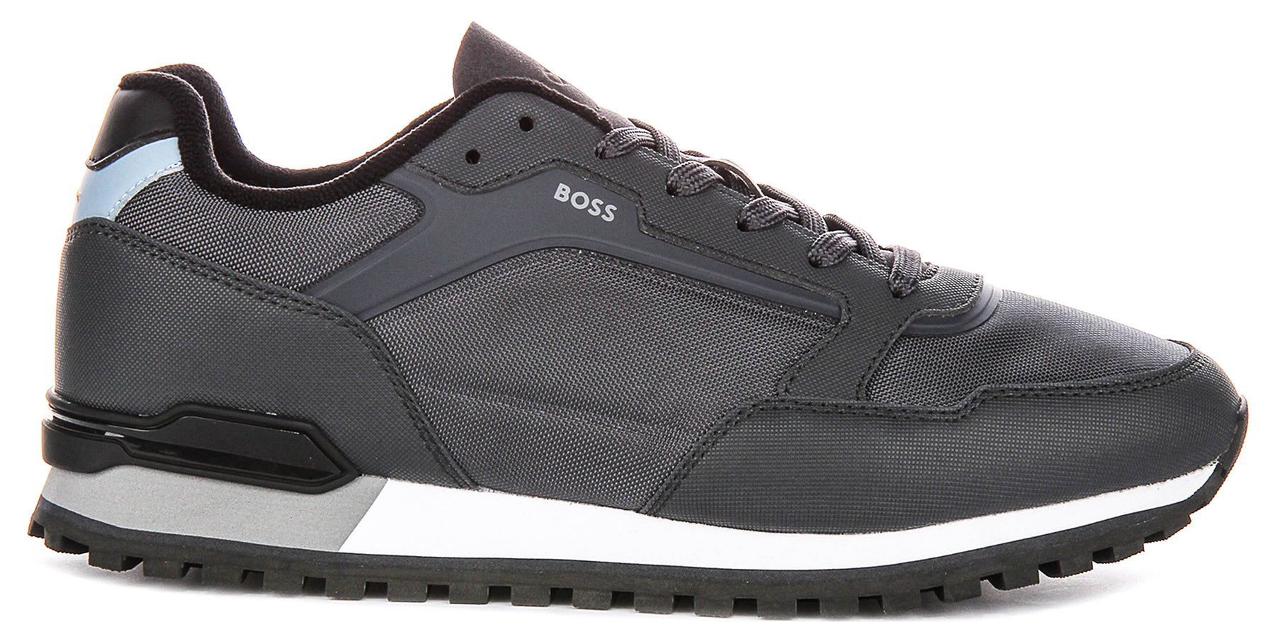 These Boss Parkour L Runn Mens Trainers are a versatile choice for the man who values understated luxury and practical style. Their sophisticated dark grey colour palette, accented with a subtle light blue detail at the heel, makes them easy to pair with a wide range of outfits, from jeans and chinos to more athletic leisurewear. Step out in confidence and comfort with this exceptional pair of trainers from Boss.