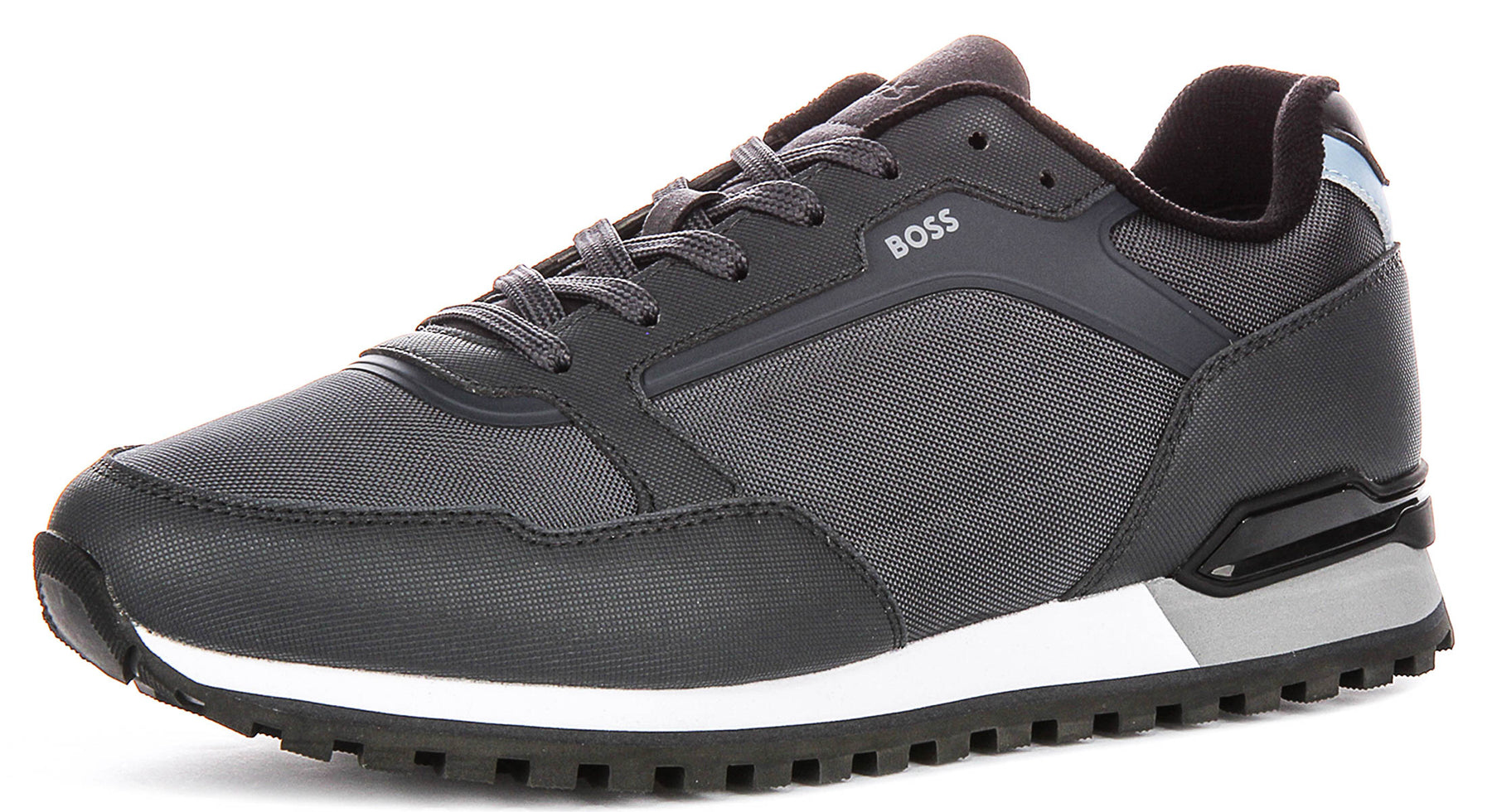 The upper of these stylish trainers is meticulously crafted from a high-quality mesh material, providing excellent breathability to keep your feet cool and comfortable throughout the day. This is complemented by durable synthetic overlays in a slightly darker shade of anthracite, strategically placed around the toe, lacing system, and heel for added structure and support. The multi-textured design features a subtle striped pattern on the mesh panels, adding visual interest to the deep, sophisticated dark grey base colour. Discreet Boss branding is elegantly displayed on the side panel and tongue, affirming the shoe's premium lineage.
