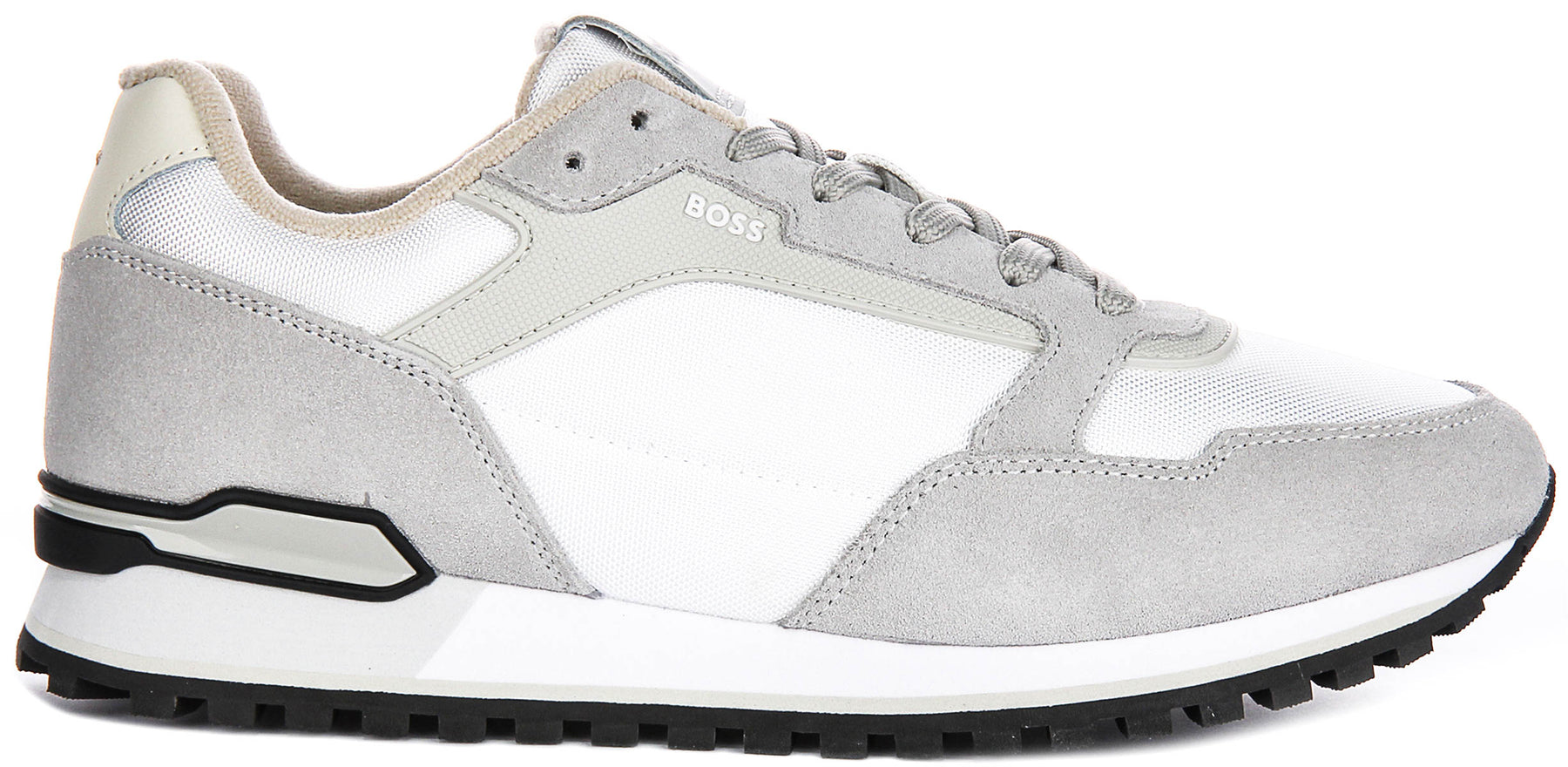 Product details: Boss Parkour L Runn men’s trainers. Outer material: suede and mesh. Target gender/group: mens. Colour: light grey/white (as shown; colour code not specified). Closure: lace-up. Lining: soft textile. Midsole: lightweight cushioning. Outsole: rubber with lugged tread. Branding: Boss logos to tongue, side and heel.