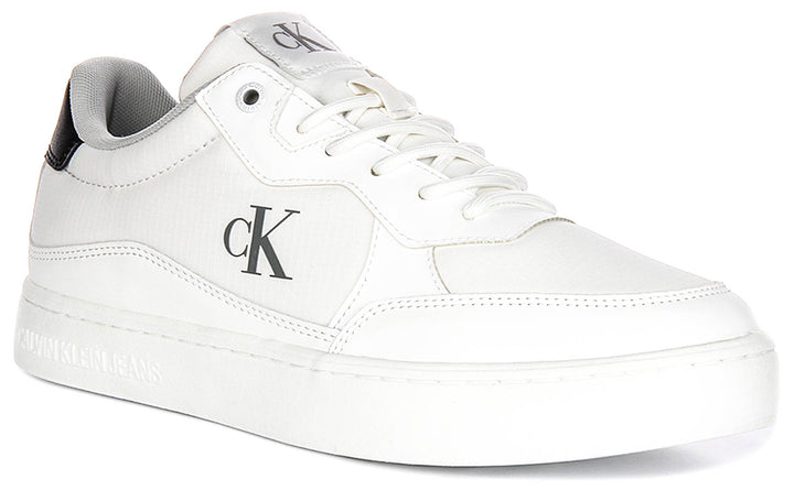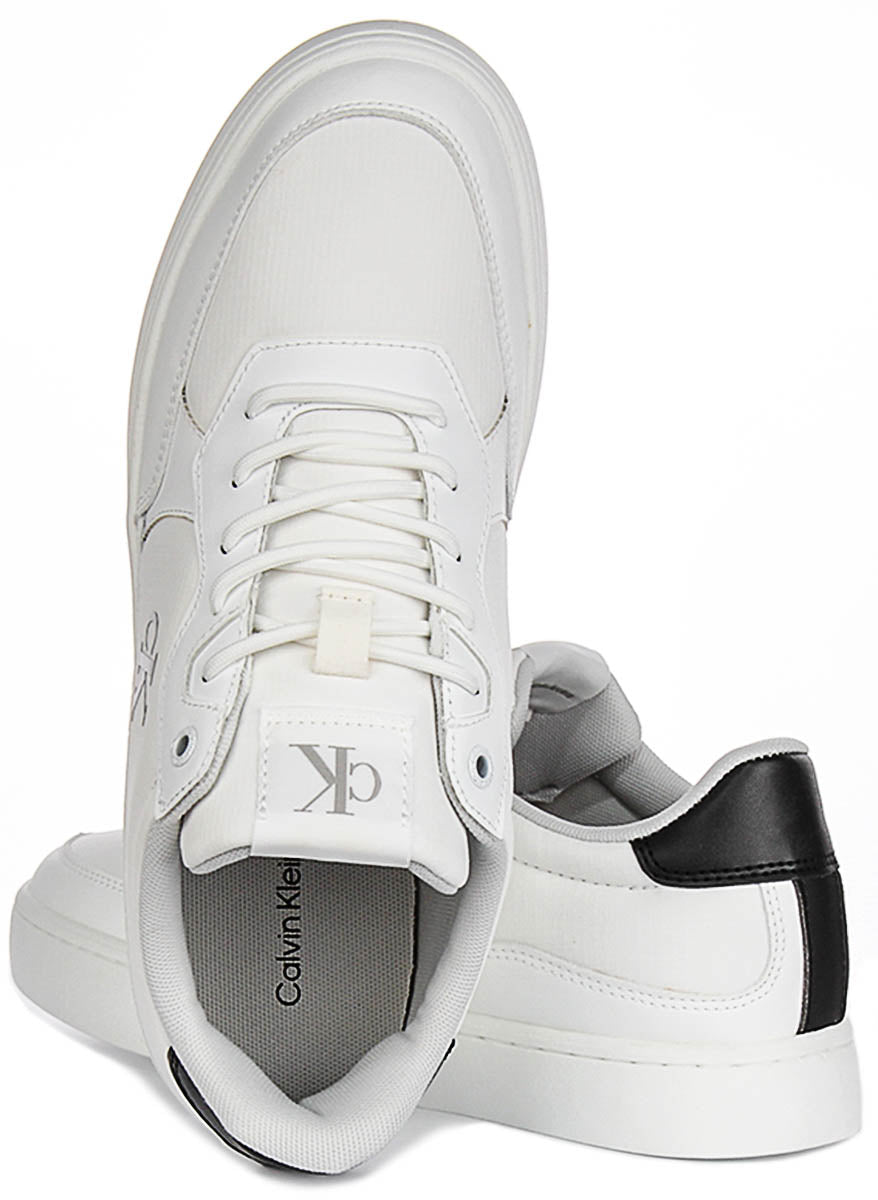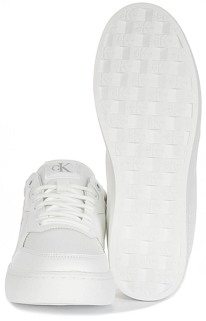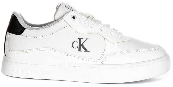 Crafted with a durable textile outer material, these trainers provide a lightweight and breathable experience, ensuring maximum comfort throughout the day. The sleek white finish is complemented by subtle black accents at the heel and a bold "cK" logo on the side, which gives the shoes a signature designer touch. The branding continues with "Calvin Klein Jeans" subtly embossed along the side of the sole, adding an extra layer of elegance to the overall design.